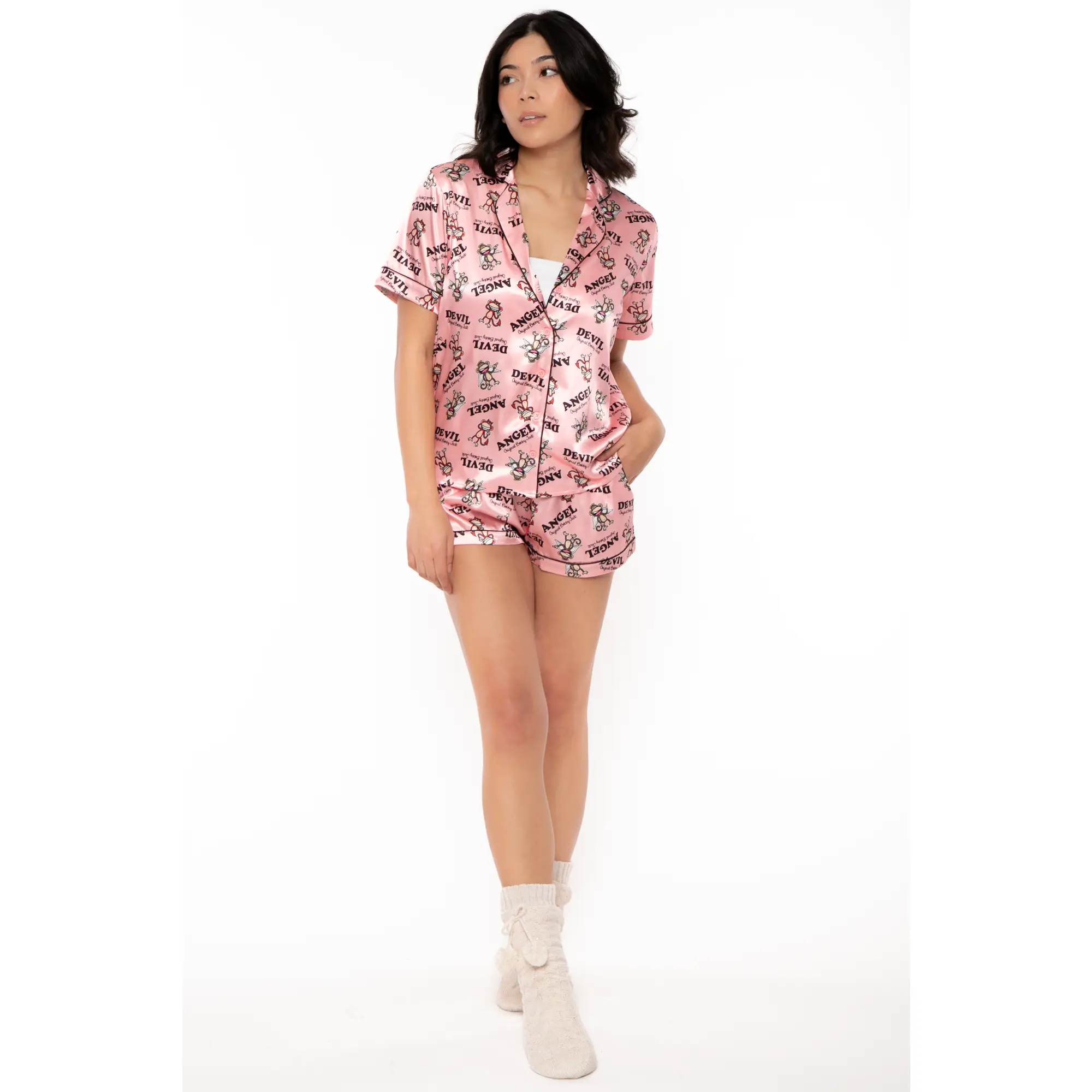 Bobby JackPajama and LoungeSet (Women's Size).This set features a pajama shirt with an allover striped pattern, "Angel" and "Devil" text and character graphics, piped trim, short sleeves, a chest patch pocket, and notched lapels, as well as a pair of matching shorts.