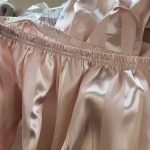 As pictured. Soft material (poly not silk), super cute. Clean, well packaged and no odors! Shop with confidence. Returned mine only due to sizing, size up by a size to be safe💕