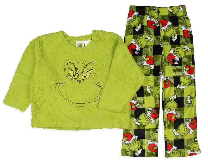 Dr. Seuss GRINCH Santa Plaid Plush Fleece Pajama Sleep Set