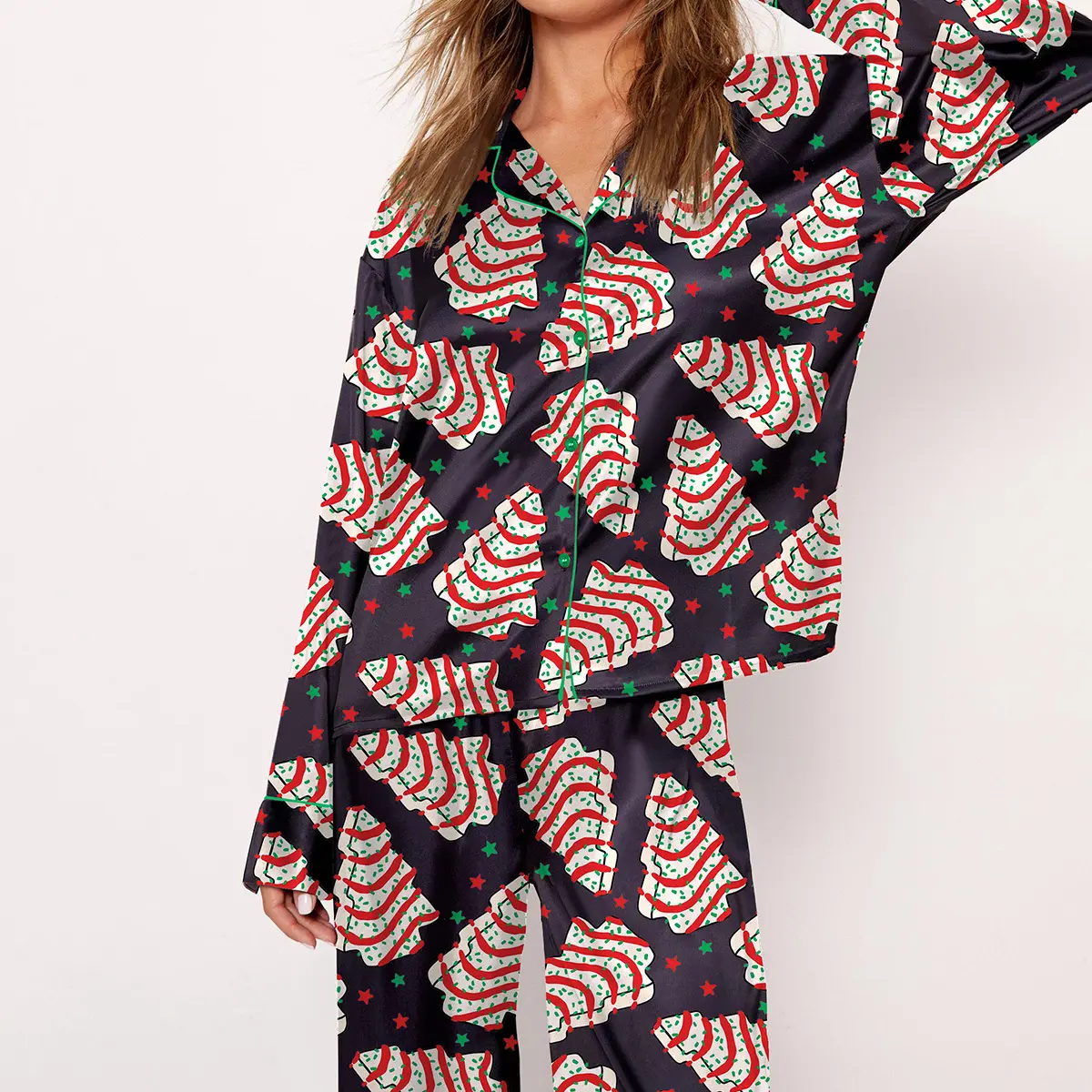 Christmas Tree Cakes Pajama Set For Women Print Comfy Satin Sleepwear & Loungewear Pjs Short Sleeve Top & Bottoms Shorts Without Pockets - SHESHOW