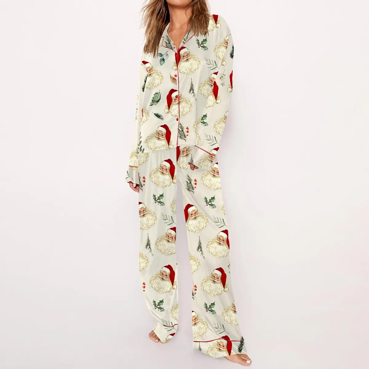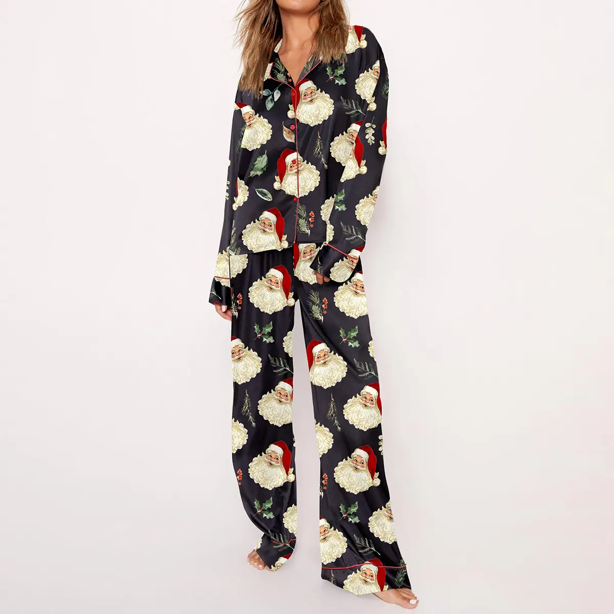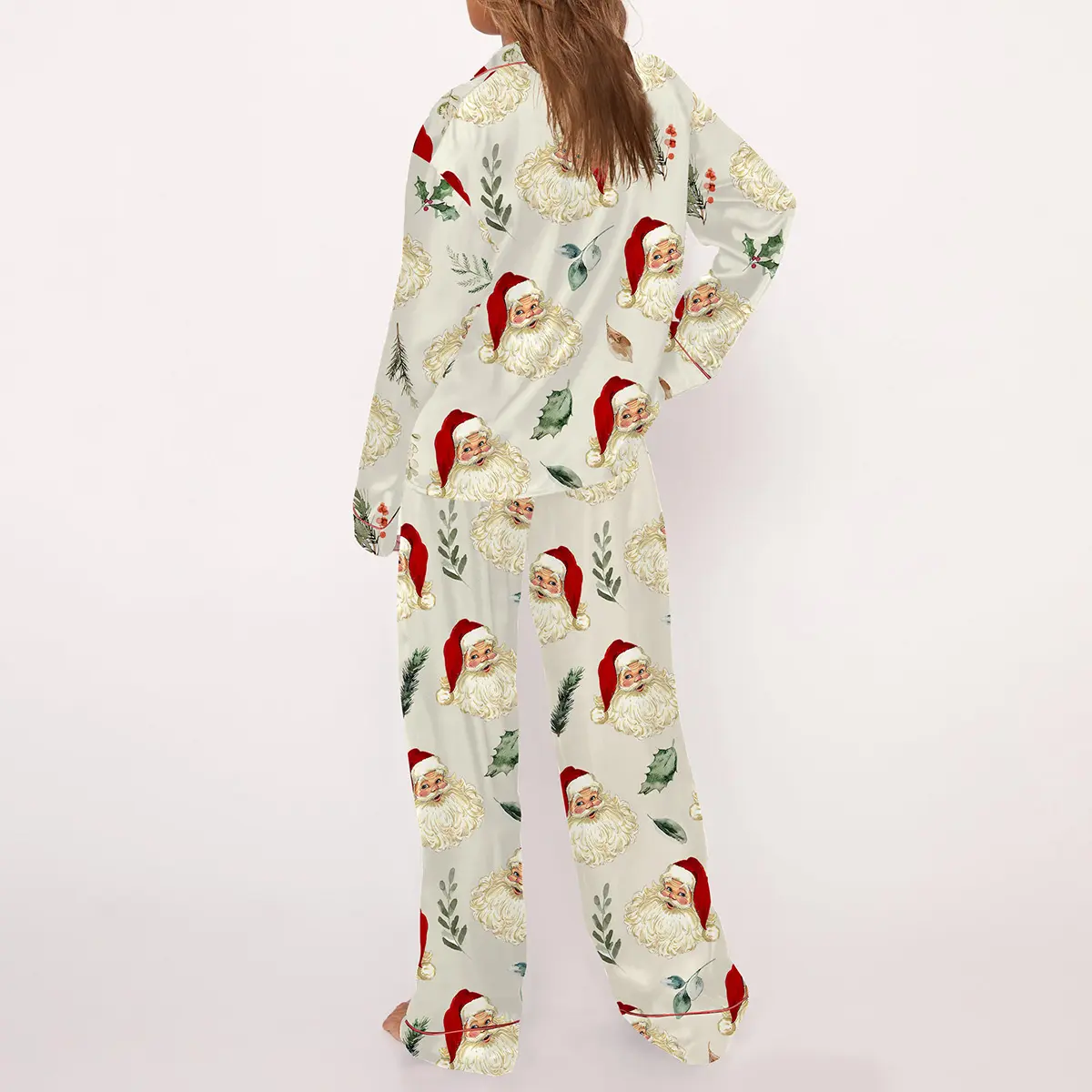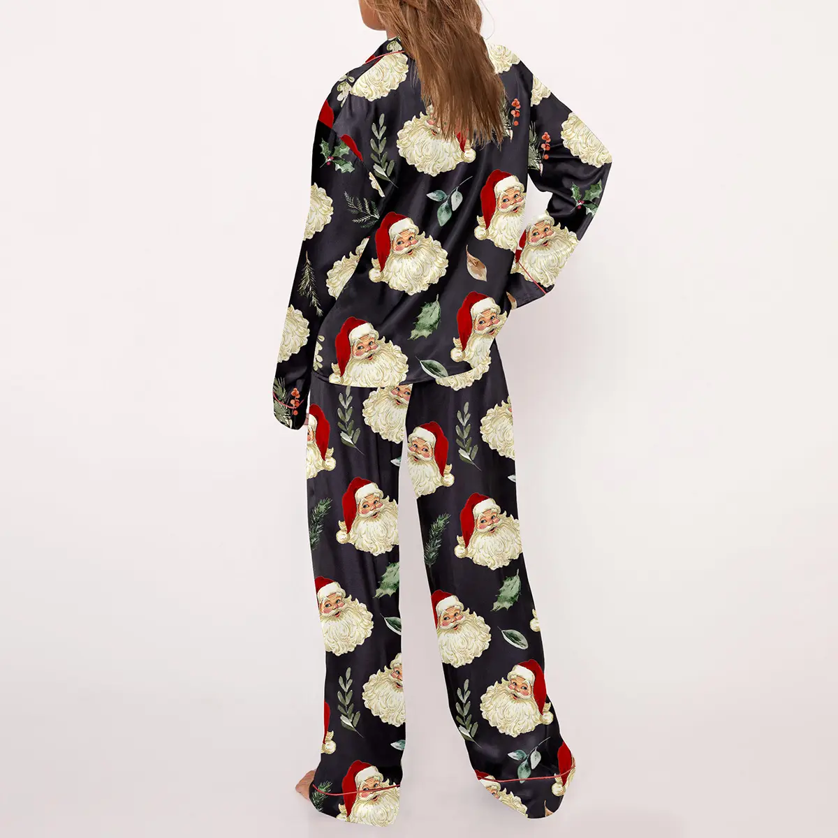 5. Christmas Vintage Santa Pajama Set For Women Print Comfy Satin Sleepwear & Loungewear Pjs Printing Silky Top & Bottoms - SHESHOW