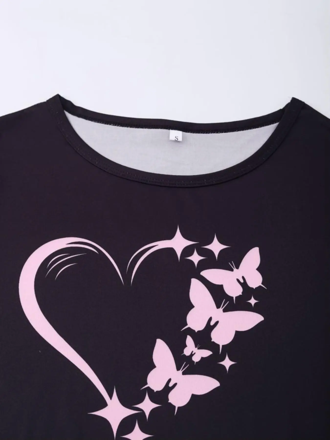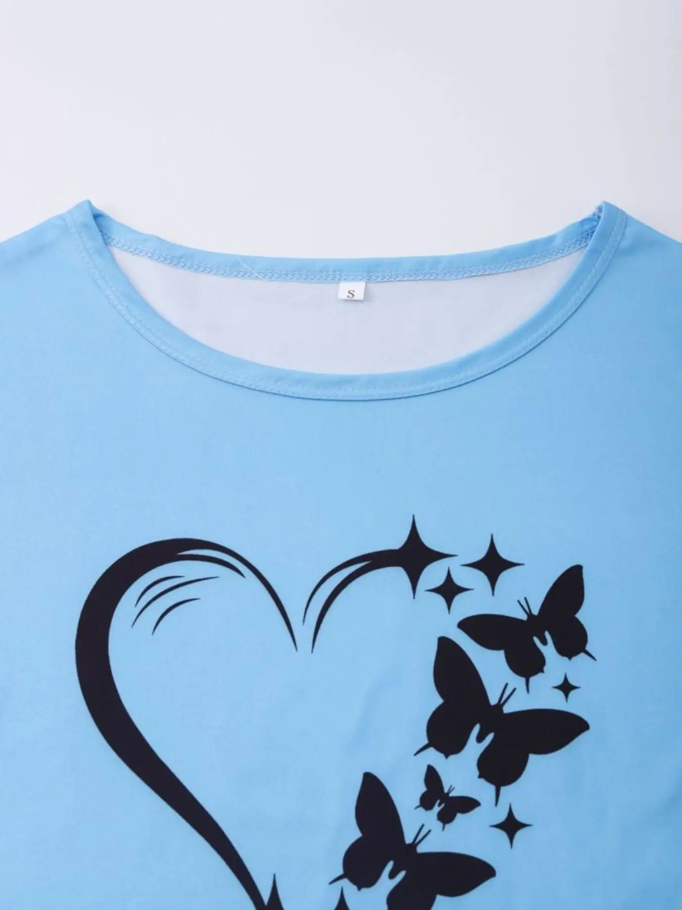 Women's Butterfly & Heart Print Tee & Elastic Waist Pants Pyjama Set, Casual Comfy Round Neck Short Sleeve T-shirt & Trousers PJ Set, Ladies Sleepwear for All Seasons, Sweetheart Pajama Set