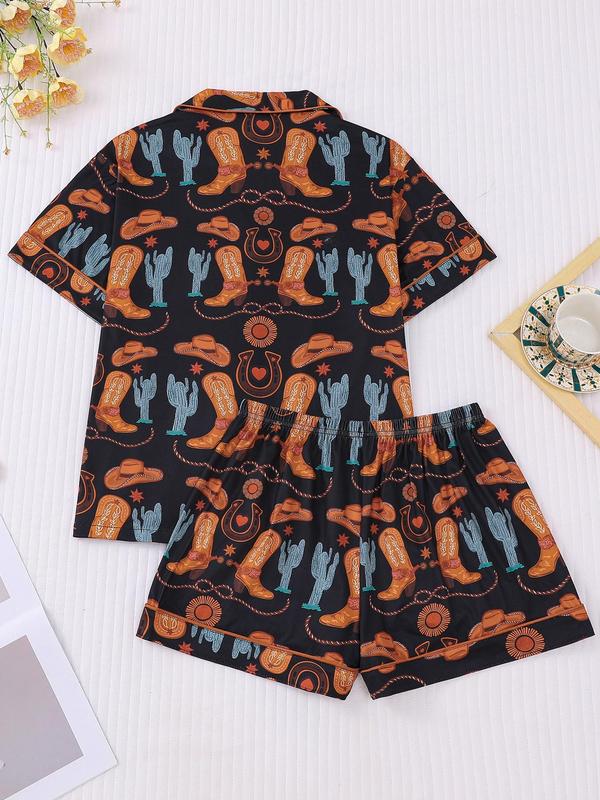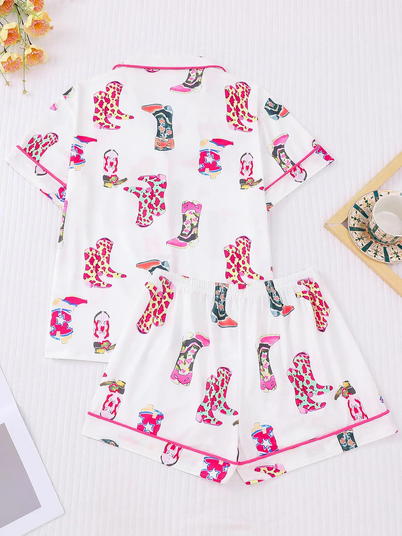 Women's All Over Cowboy Boots Print Pajama Two-piece Set, Casual Comfy Short Sleeve Lapel Neckline Tee & Shorts PJ Set, Ladies Summer Sleepwear