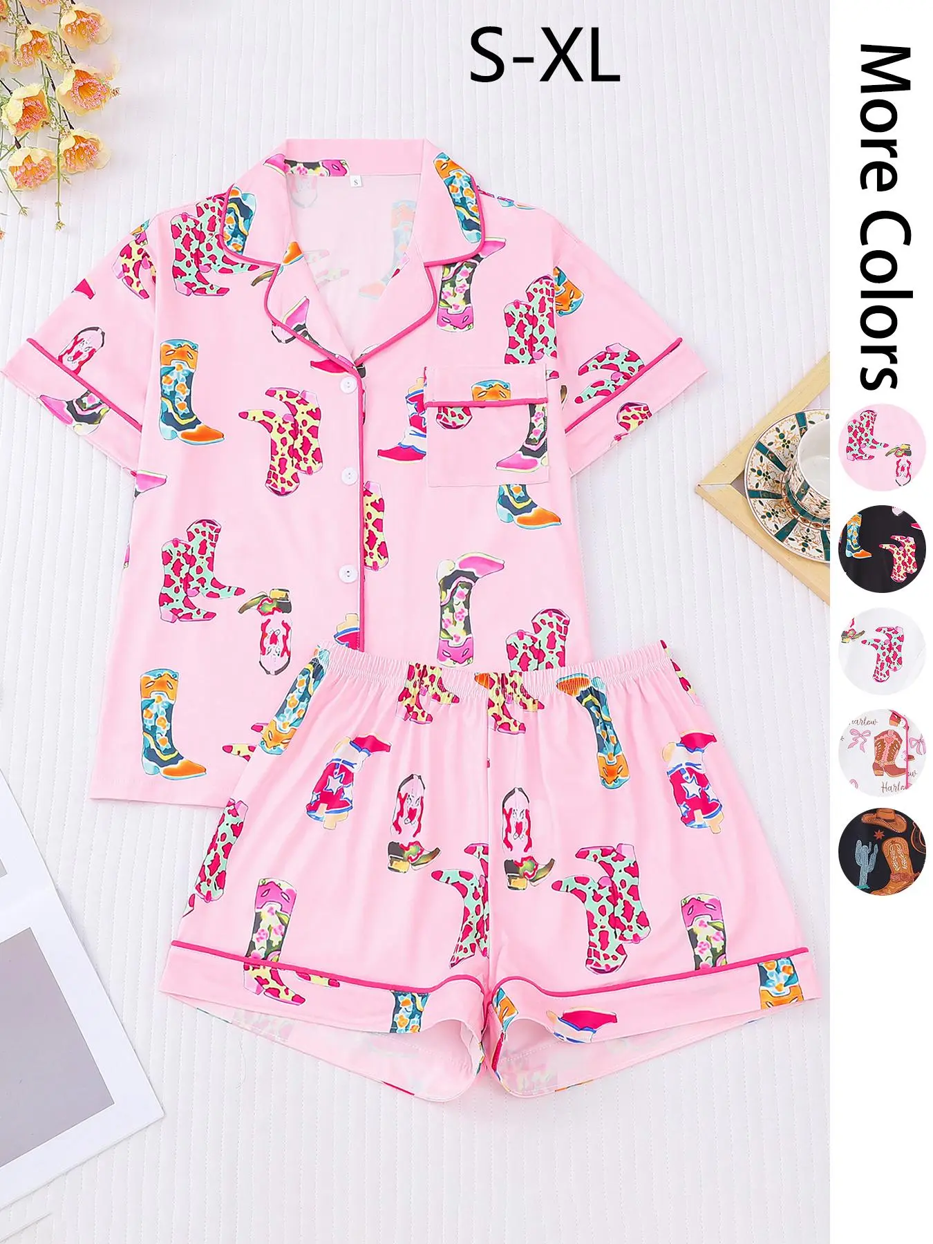 5. Women's All Over Cowboy Boots Print Pajama Two-piece Set, Casual Comfy Short Sleeve Lapel Neckline Tee & Shorts PJ Set, Ladies Summer Sleepwear