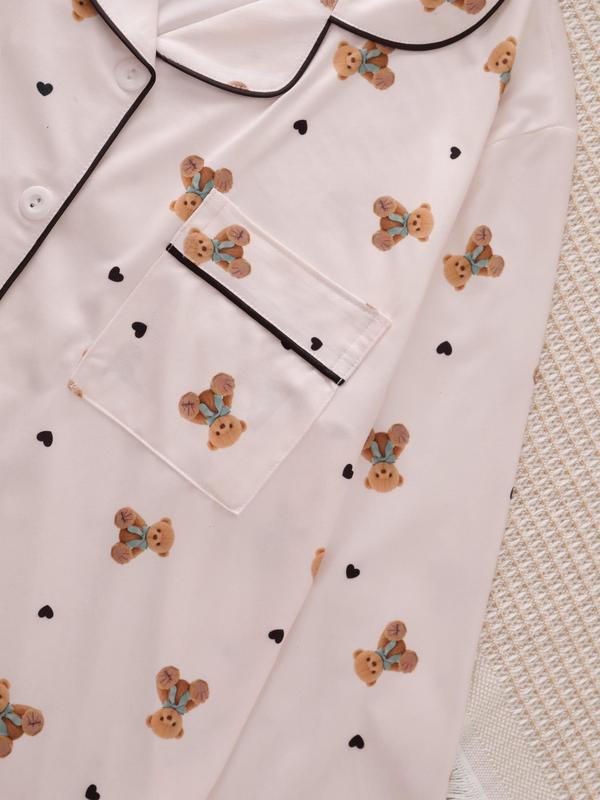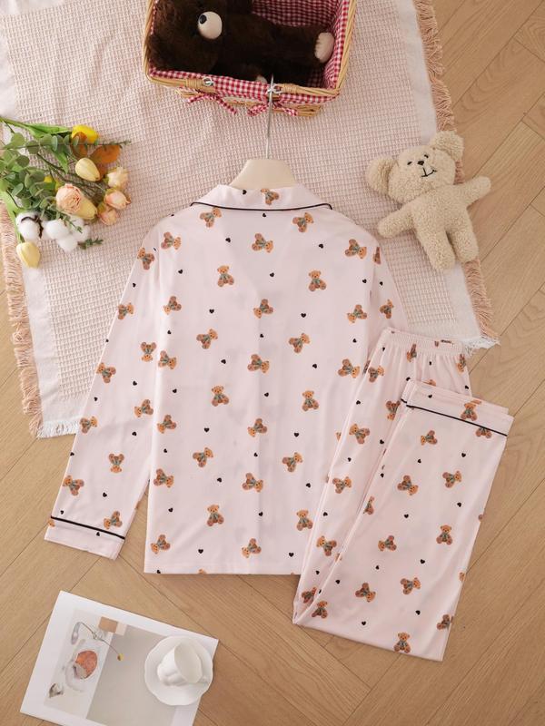 5. Two-piece Set Women's Heart/ Strawberry Print Pajama Set, Casual Comfy Long Sleeve Lapel Collar Top & Pants Pj Set, Ladies Sleepwear for Spring & Fall