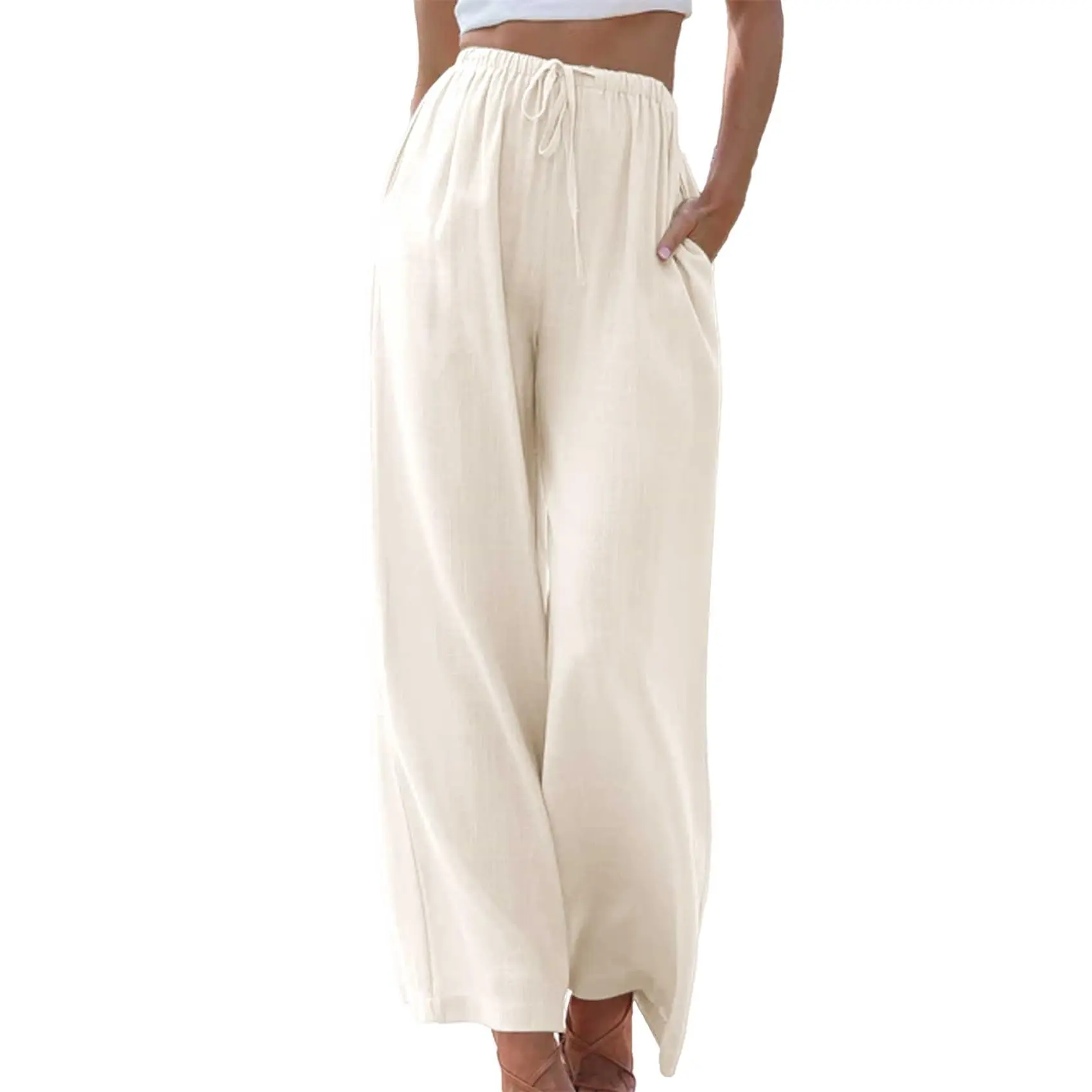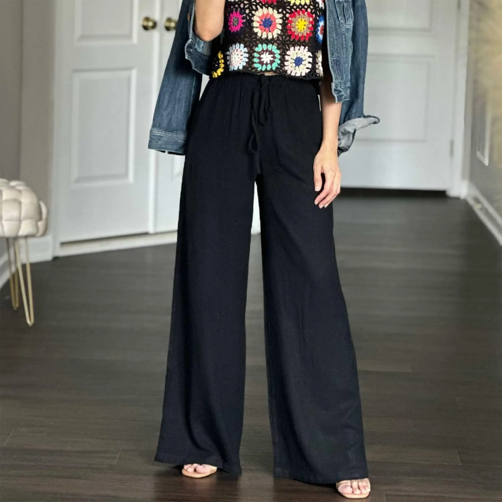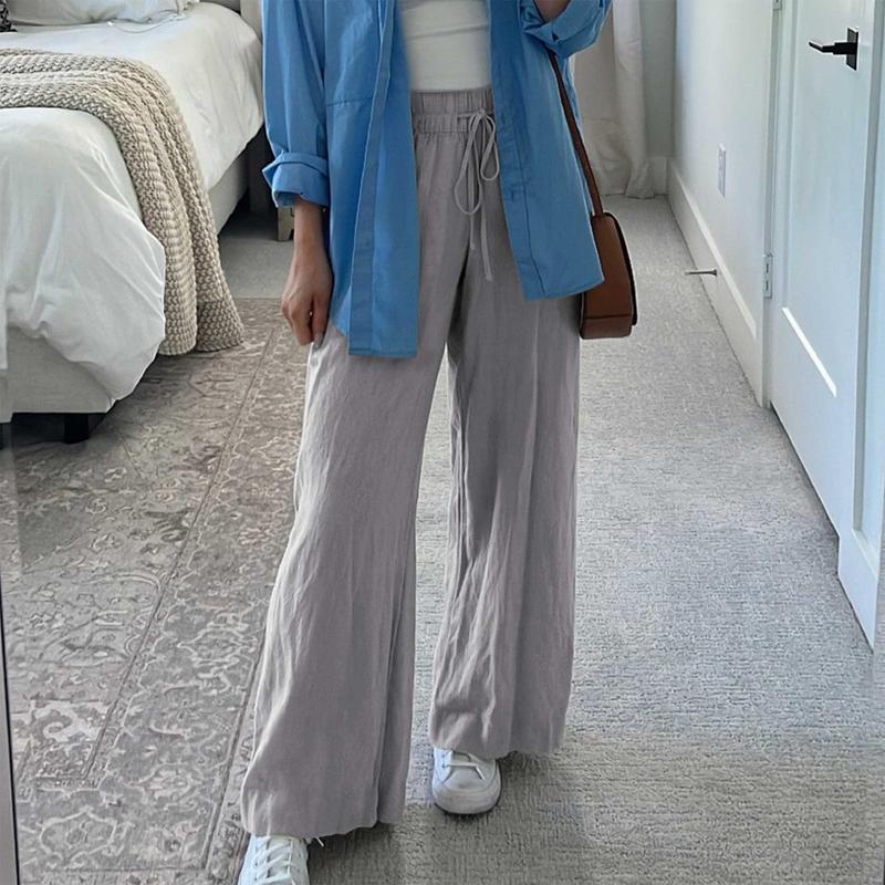 Fabric type: 70% cotton, 30% linen. Lightweight summer cotton-linen pants, casual style, solid color fabric, side pockets, drawstring + elastic waistband, wide-leg cut, excellent breathability, relaxed fit.