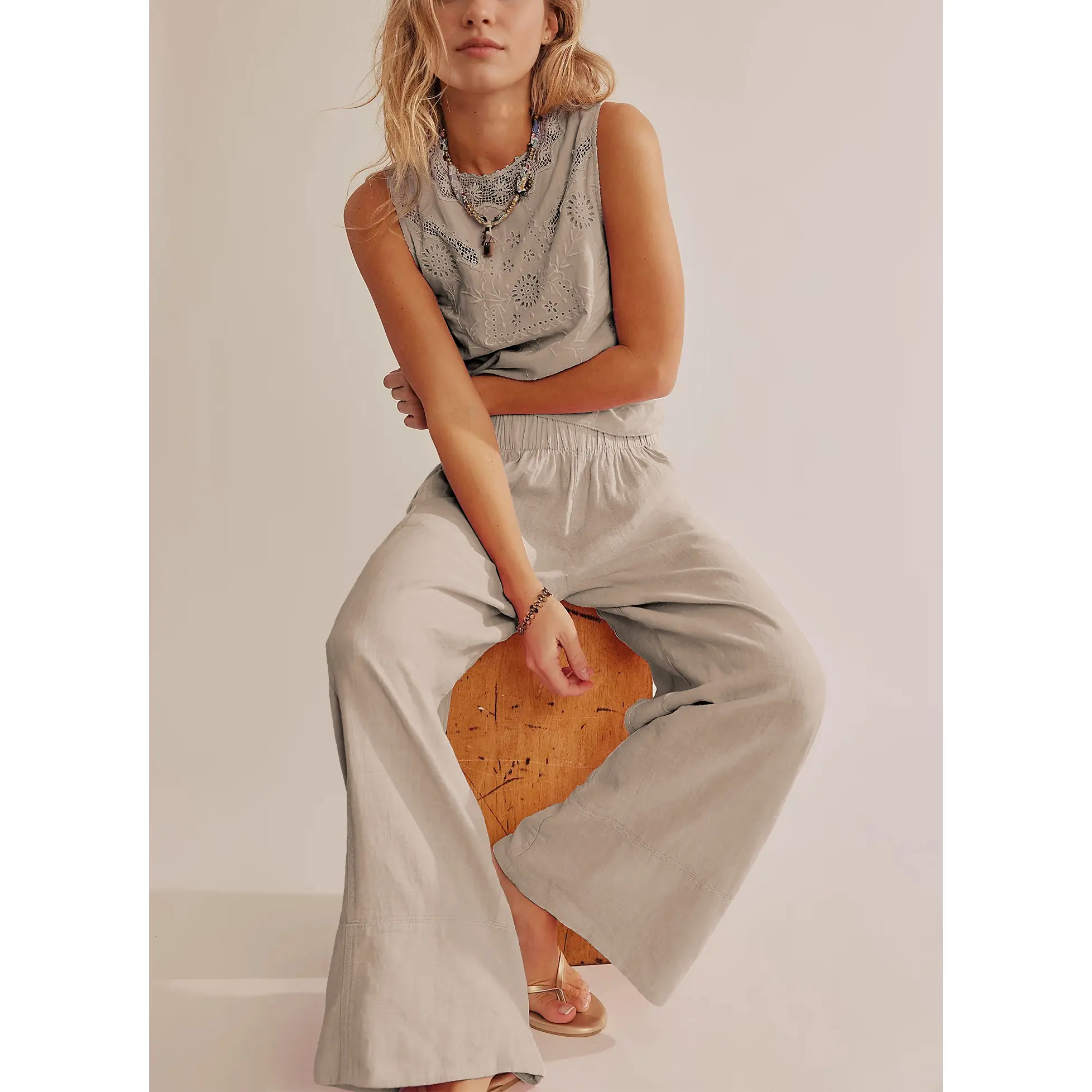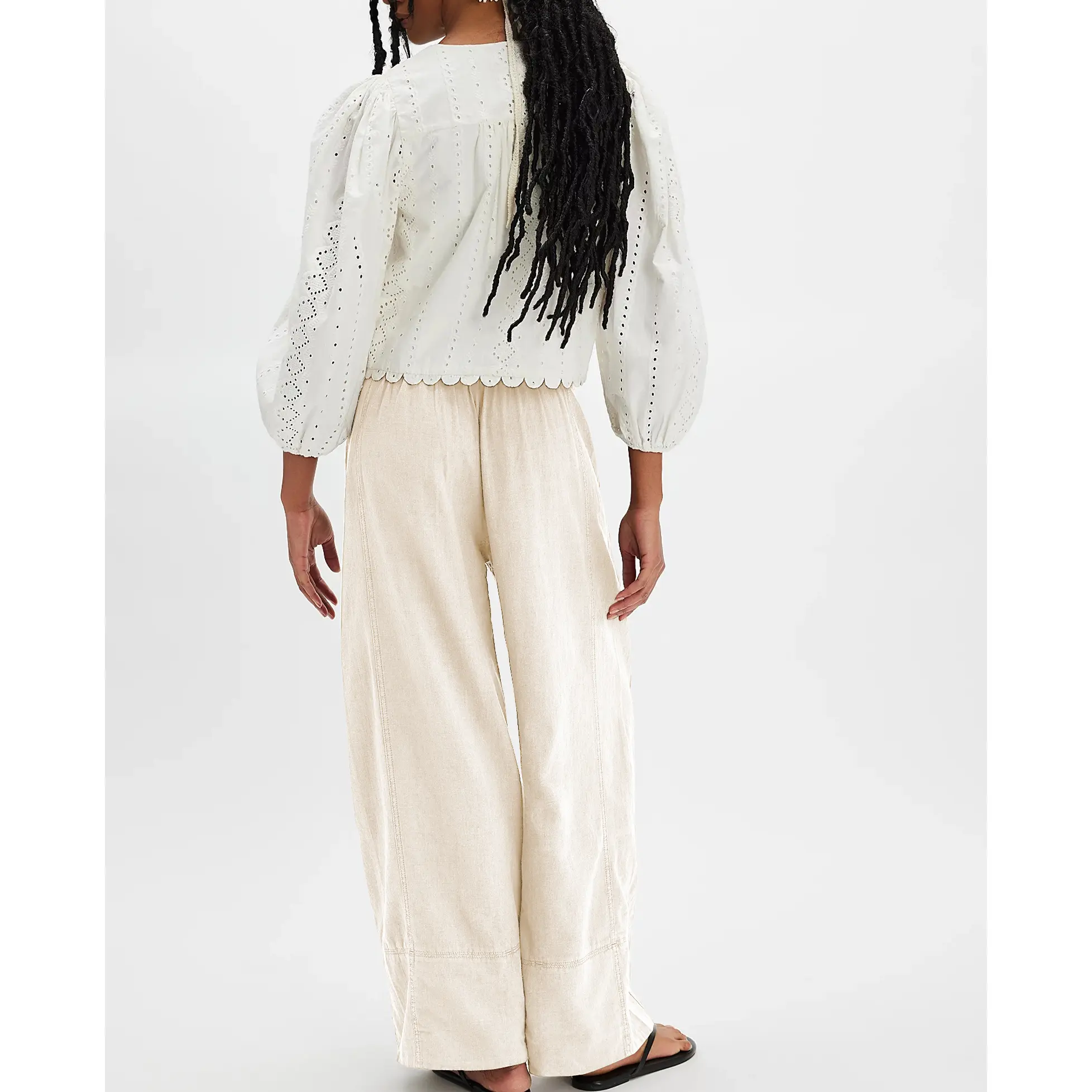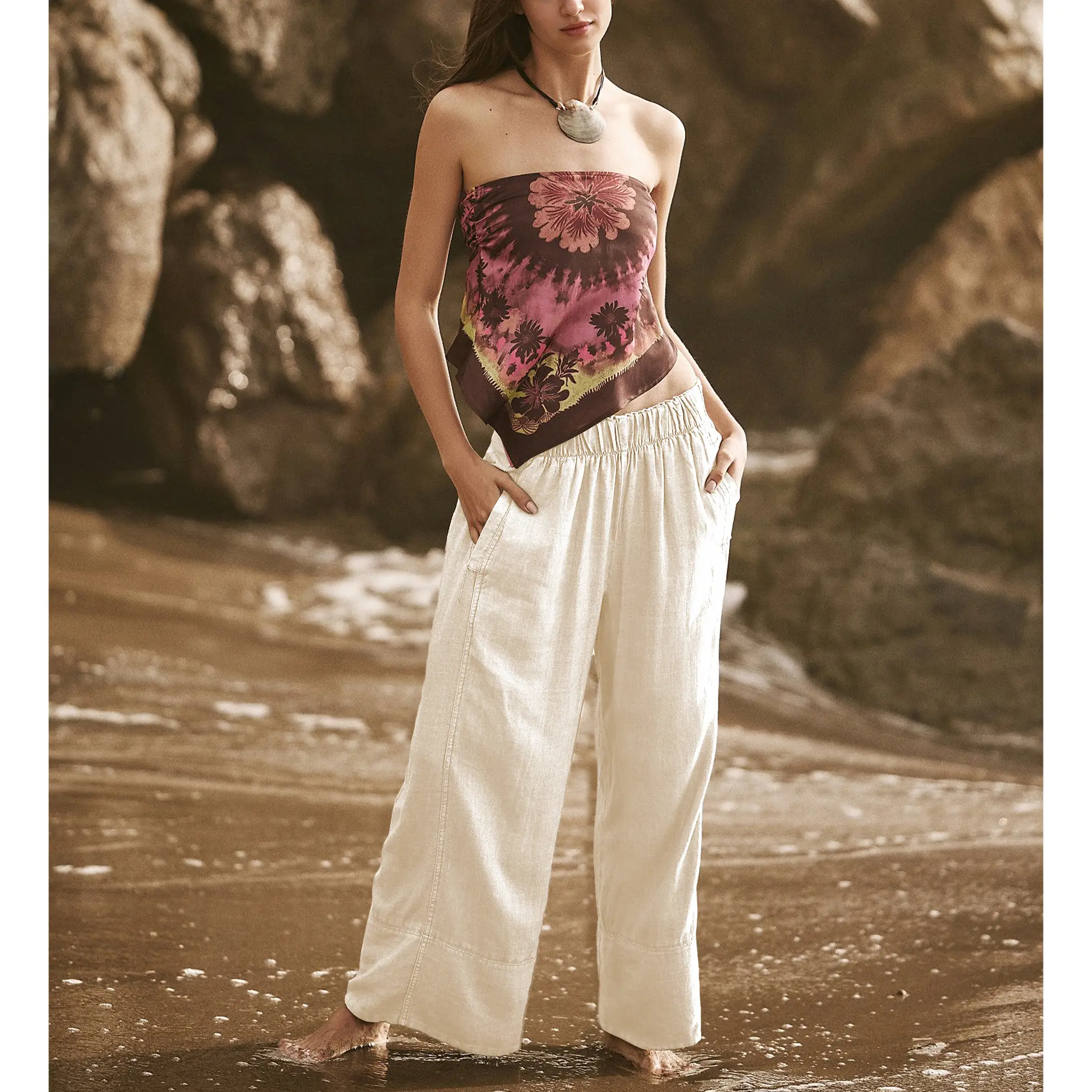 Fabric type: 70% cotton, 30% linen. Lightweight summer cotton-linen pants, casual style, solid color fabric, side pockets, drawstring + elastic waistband, wide-leg cut, excellent breathability, relaxed fit.