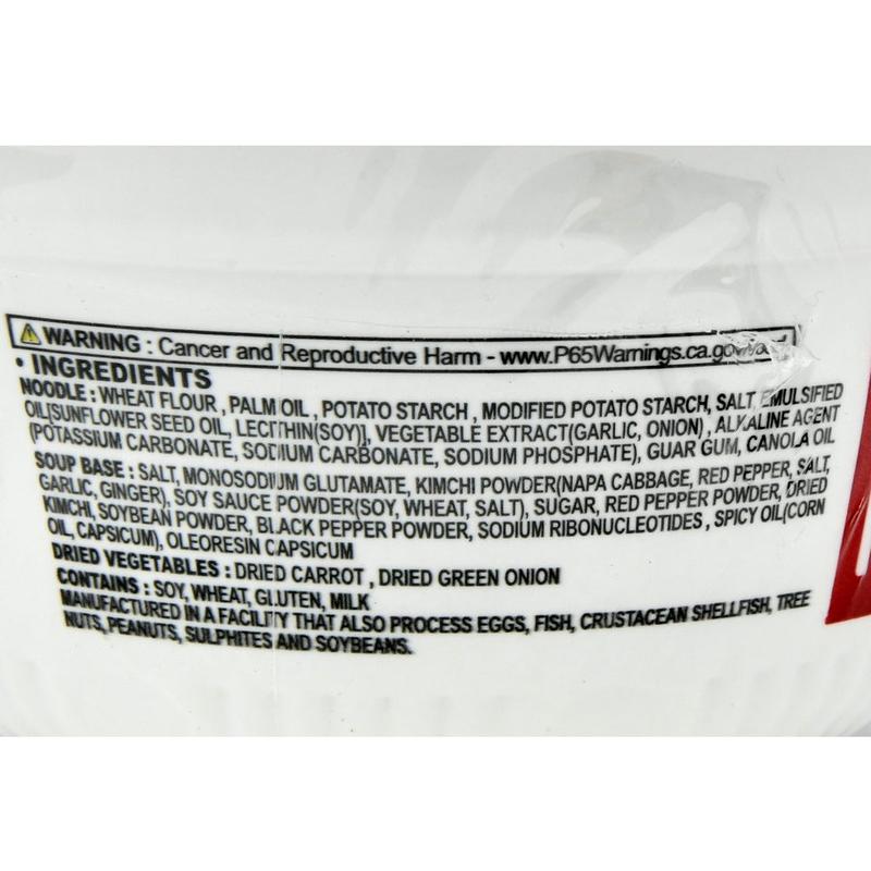 Ingredientswheat flour, palm oil, potato starch, and salt for the noodles, along with a soup base containing kimchi powder, red pepper powder, soy sauce powder, and other seasonings