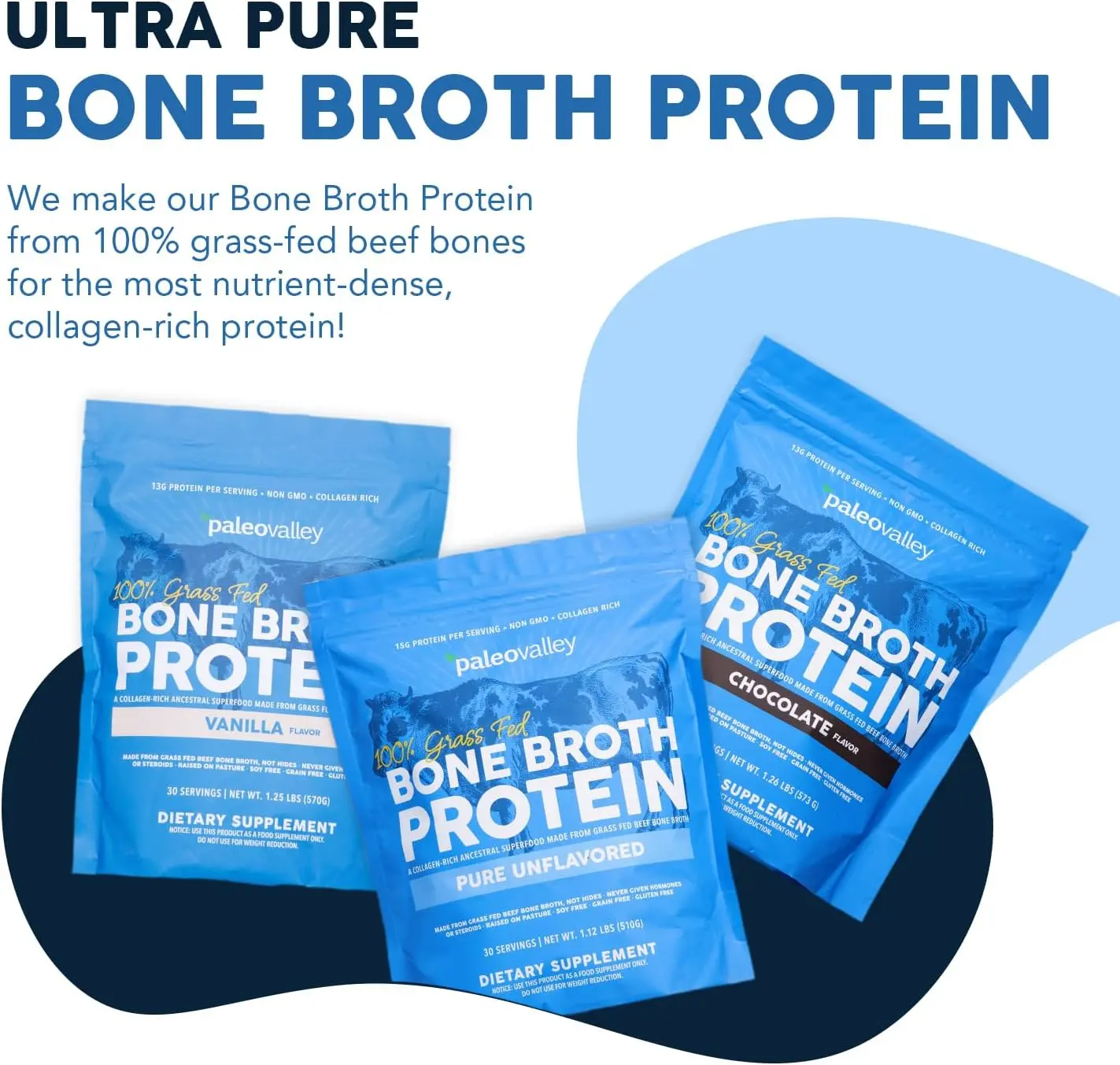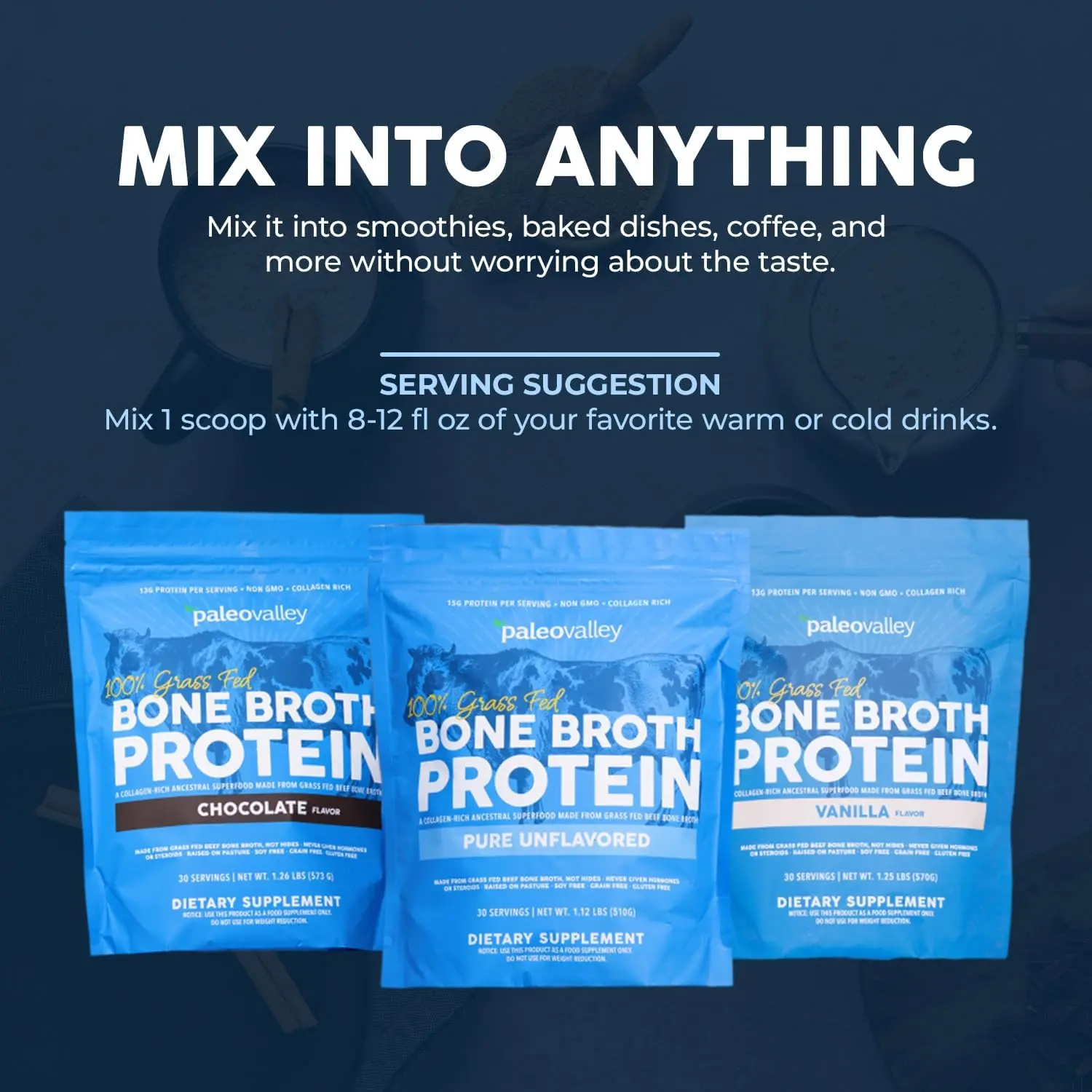 ·Mixing with milk, coffee, or water for a warm, comforting drink.Chocolate, Vanilla and Salted Caramel Grass Fed Bone Broth Protein powders bring indulgent flavor and nourishment to your favorite sweet recipes with ease.