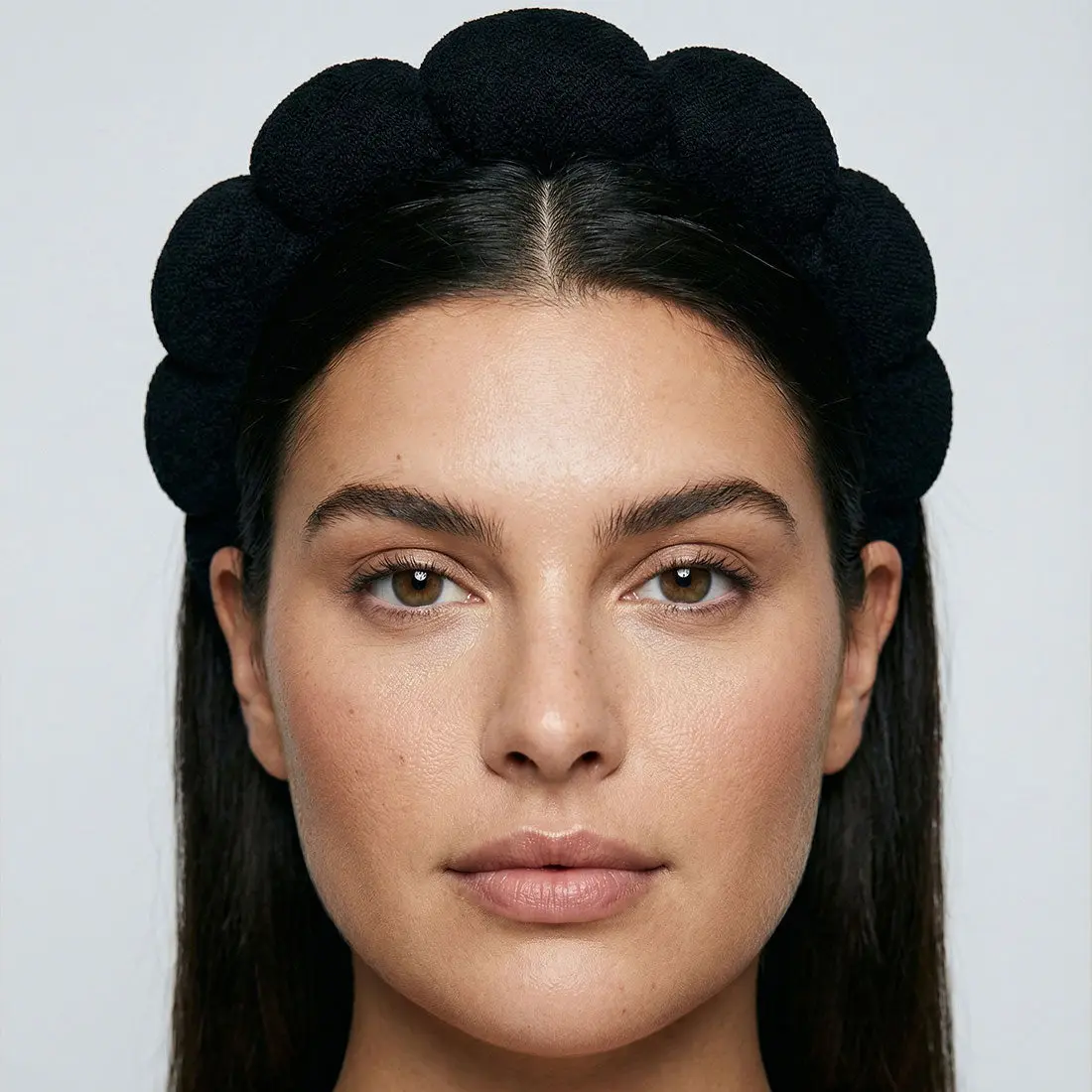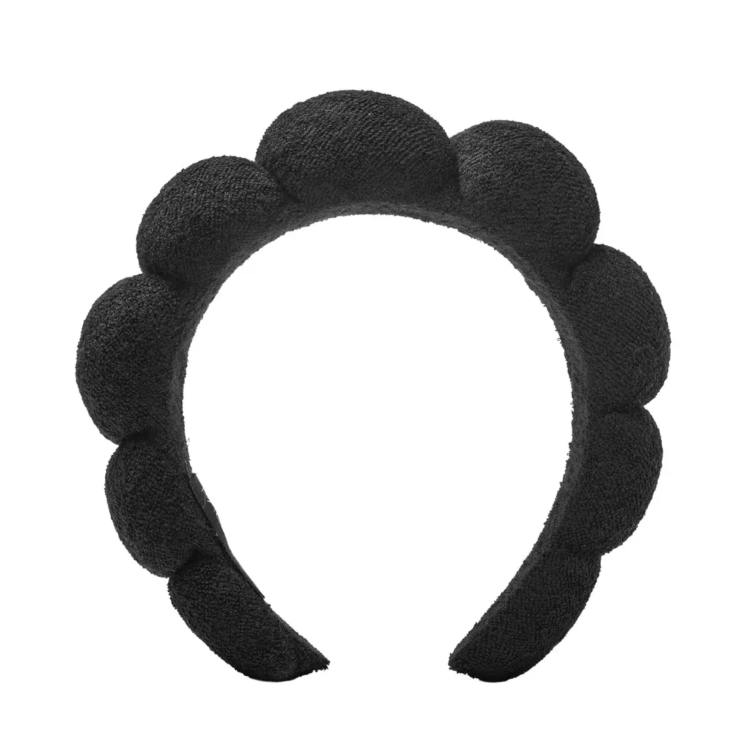 Crafted from soft, absorbent 100% polyester terry cloth, this spa-style headband provides a secure yet gentle fit that helps keep flyaways and bangs in place while you focus on your routine. The bubble-style design adds light structure for comfortable hold, while the classic black color delivers a clean, polished look suitable for home use, travel, and professional makeup application.