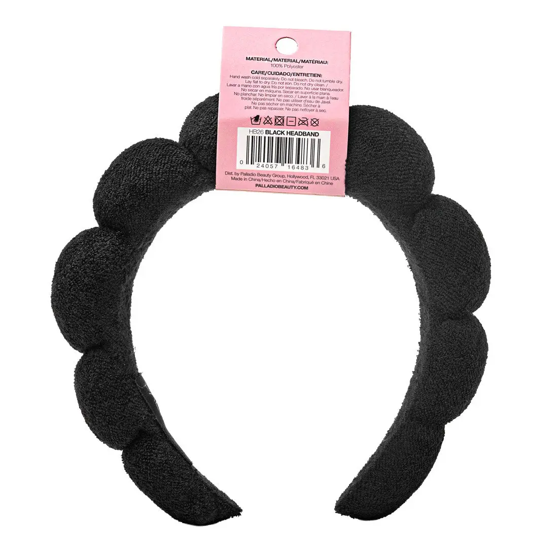 Soft terry cloth bubble headband for makeup, skincare, and face cleansing. Keeps hair securely pulled back without tugging or discomfort. Absorbent fabric ideal for washing and skincare routines. Bubble-style design provides a secure yet gentle fit. Lightweight and comfortable for extended wear. Classic black color for a clean, professional look. Features a Palladio woven logo sewn into the inner seam. Suitable for all hair types and textures.