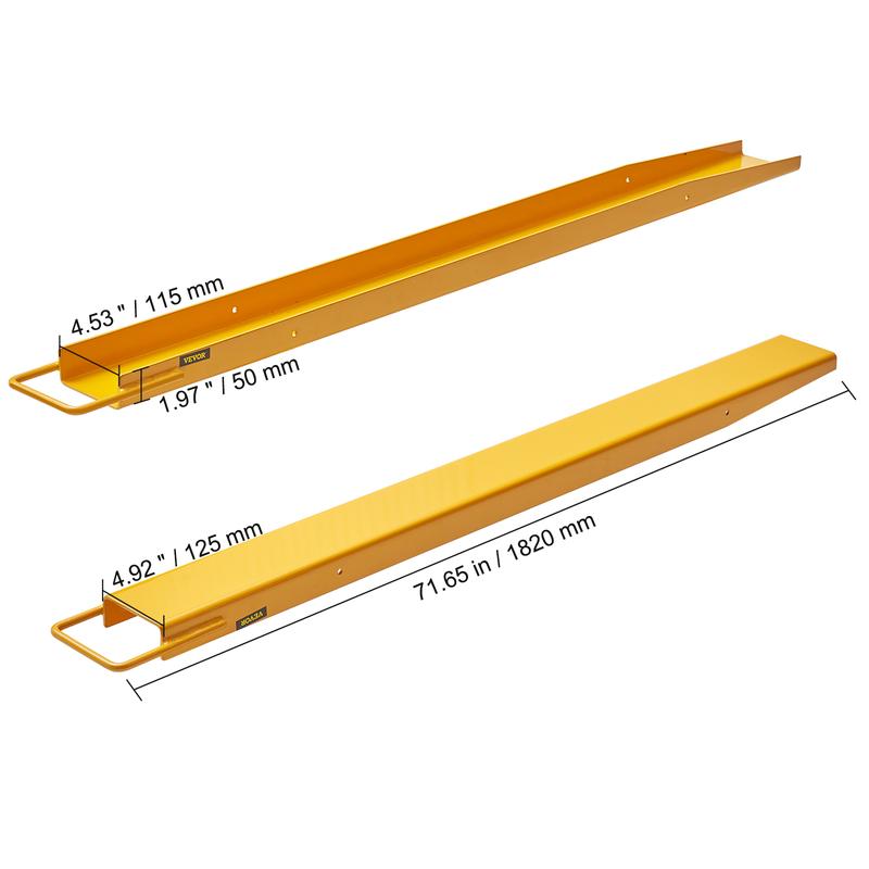 • Universal Size: With universal dimensions of 71.65"/1820 mm in total length, 4.92"/125 mm in outer width, 1.97"/50 mm in outer height, and 4.53"/115 mm in inner width, these forklift fork extensions snugly fit 4.2" wide forks. It's like they were made for each other!
