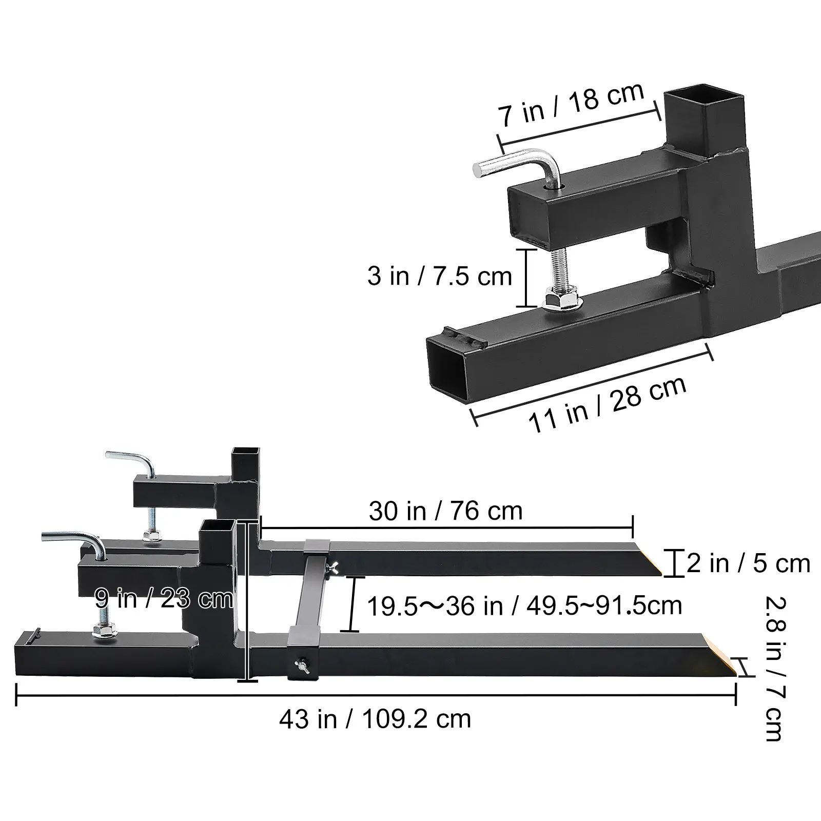• Product Dimensions: This pallet fork for tractor and bucket measures 43" overall length, with a 30" fork blade. The blade has a height of 2" and a width of 2.75". The gap between the lip of the bucket and the blade is 2.95". The adjustable range of the stabilizer bar is 19.5" to 36 "W. Each package contains 1 x fork, 1 x stabilizer bar, and 1 x user manual.