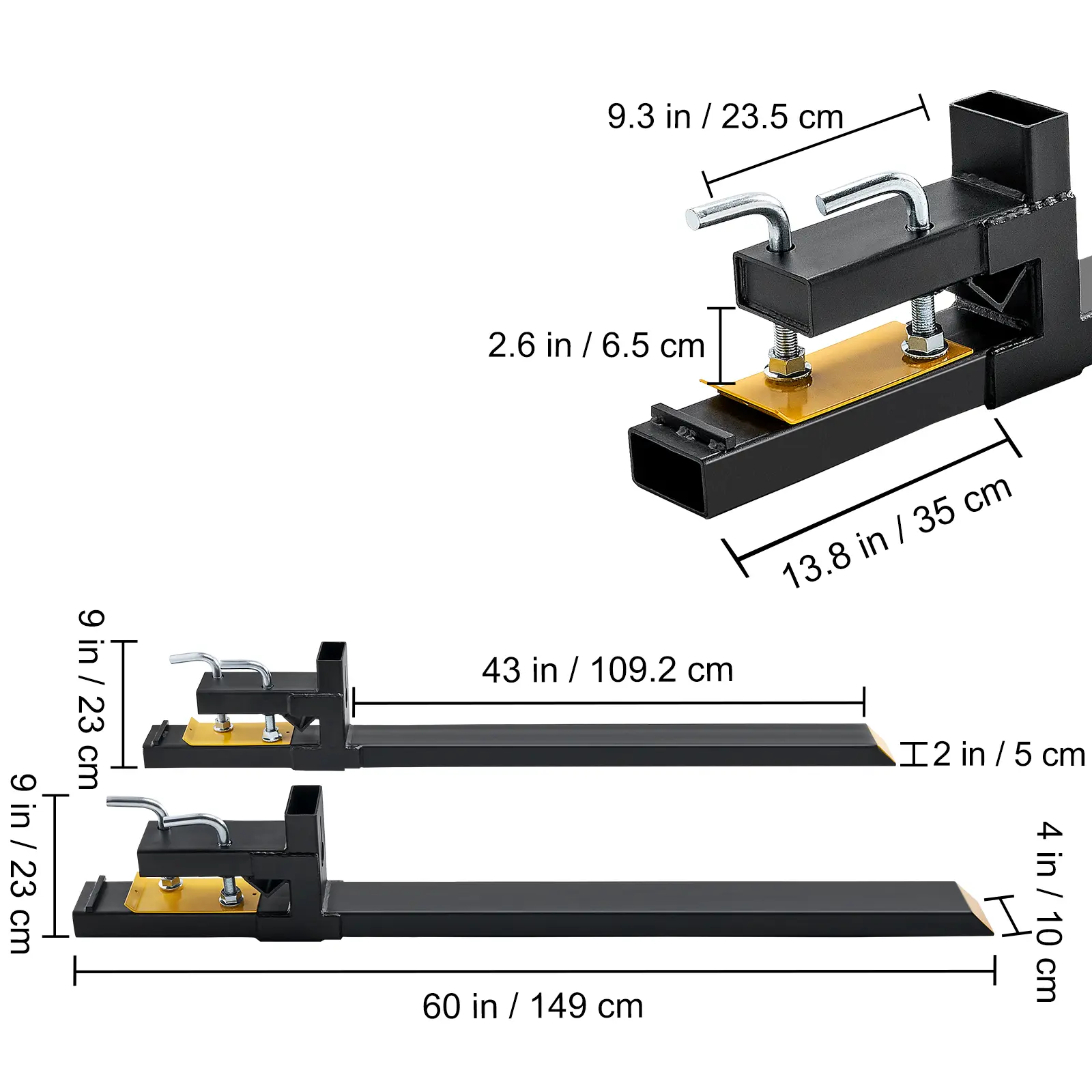 • Product Dimensions: This pallet fork for tractor and bucket measures 60" overall length, with a 43" fork blade. The blade has a height of 2" and a width of 2.75". The gap between the lip of the bucket and the blade is 2.95". Each package contains 2 x Pallet forks and 1 x user manual.