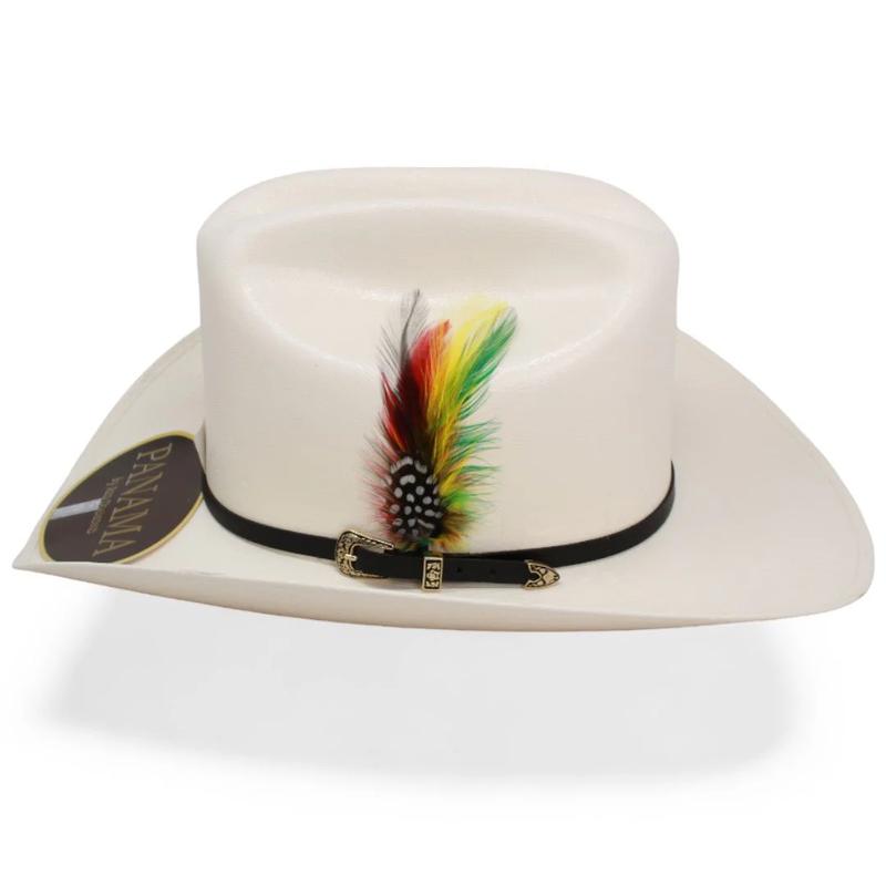 This exquisite piece is made from Shantung (Rice Paper) with a remarkable 1,000X Quality mark. It features a crown size of 4 1/2 inches and a brim size of 3 1/2 inches, providing a perfect balance of style and comfort. The hat is shaped in the unique "Panter Belico con Plumas" design and adorned with genuine feathers, adding a touch of elegance. It is branded by Panama by Red Diamond Boots, ensuring authenticity and prestige.