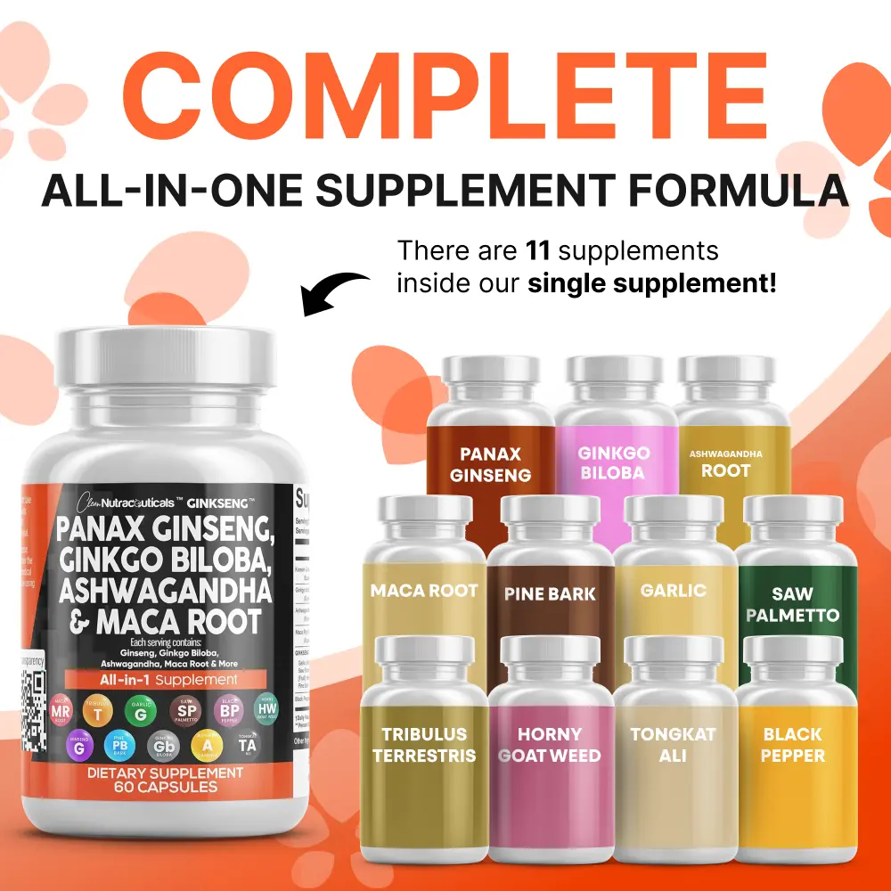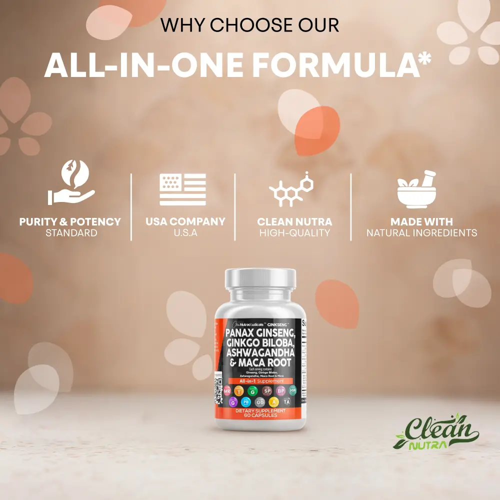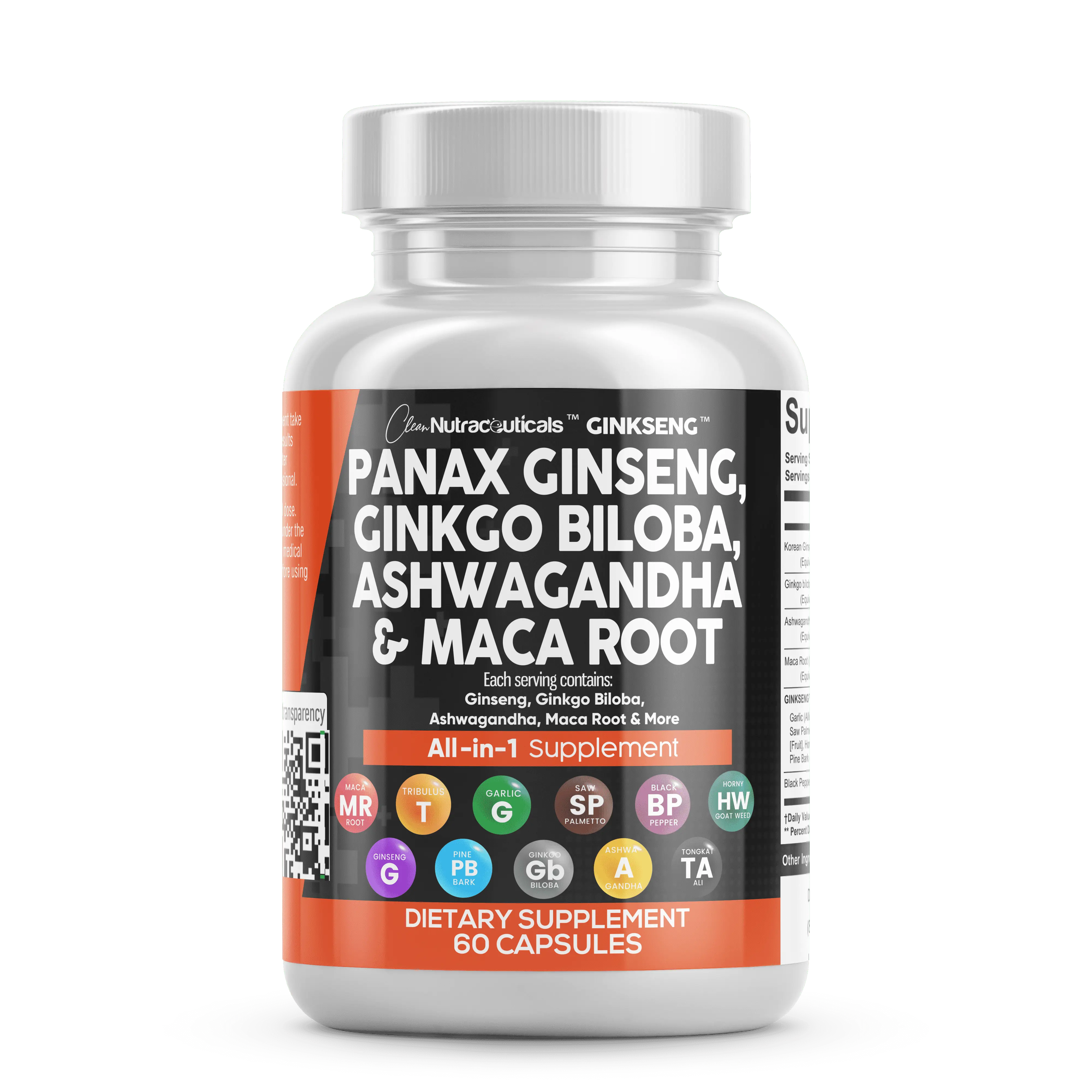 ·The Ultimate Ashwagandha Capsules & Ginseng Capsules You've Been Looking For - Clean Nutra Ginkseng provides 4 full-dose products in one for support containing a full ginkgo biloba supplements, korean ginseng extract, ashwagandha extra strength, and maca pills in a convenient 2 capsule dosage! Finally, gingko biloba supplements with red ginseng korean, ashwagandha pills and maca capsules have been packed into one convenient solution.