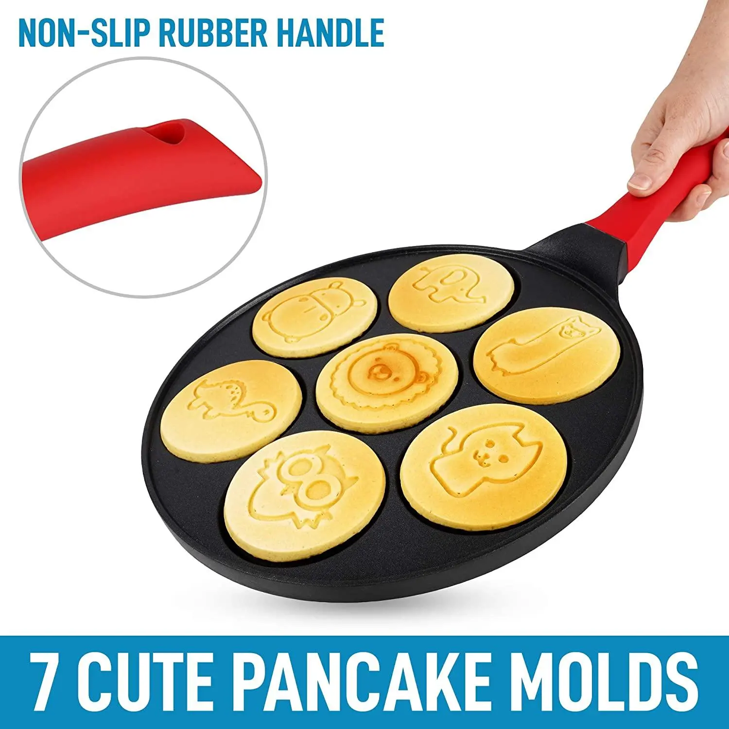 ·Ergonomic Design: Crafted from high-grade die-cast aluminum, these molds feature a black double-layer non-stick interior that ensures even cooking and easy release. The heat-resistant exterior and soft red silicone handle provide a comfortable grip for effortless flipping.