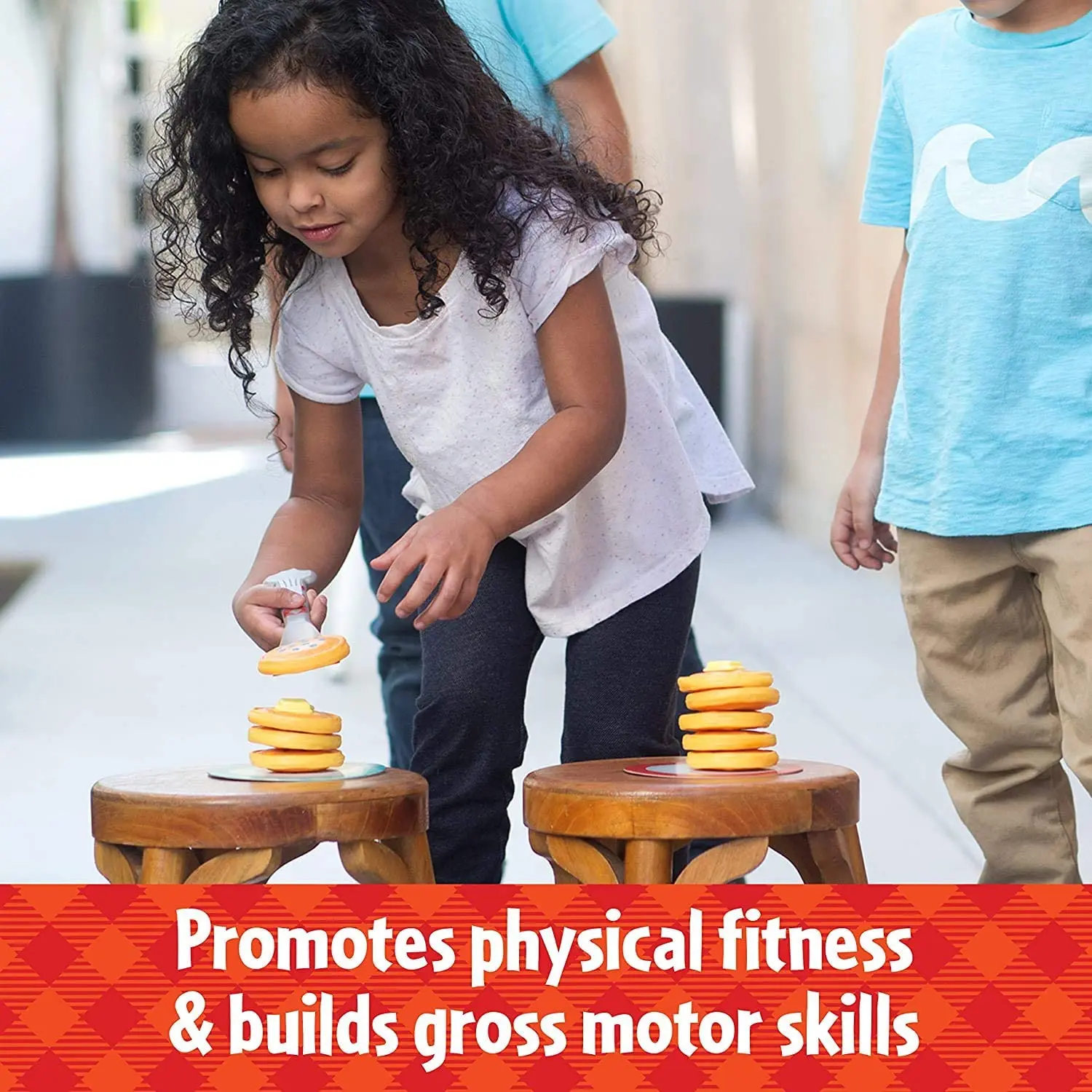 ·PLAY, LEARN, AND GROW: Playing the Pancake Pile-Up Relay Game builds gross motor skills, balance, and coordination; practices patterning, a key early math skill; and encourages social-emotional skills like taking turns, sharing, and working together