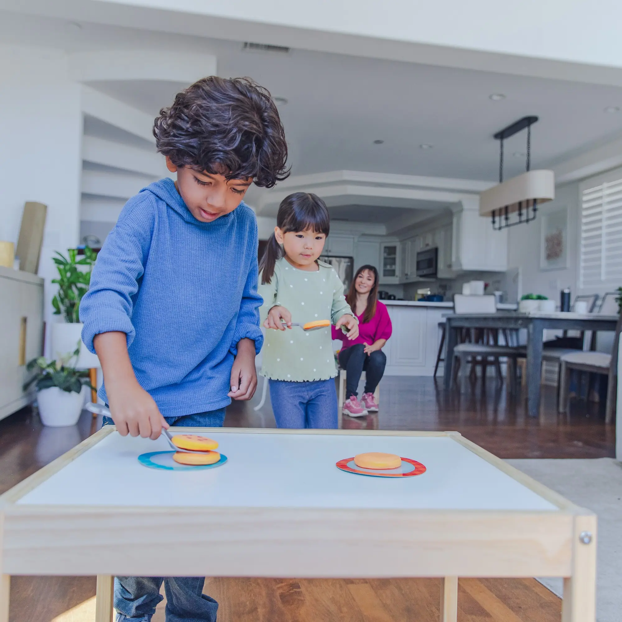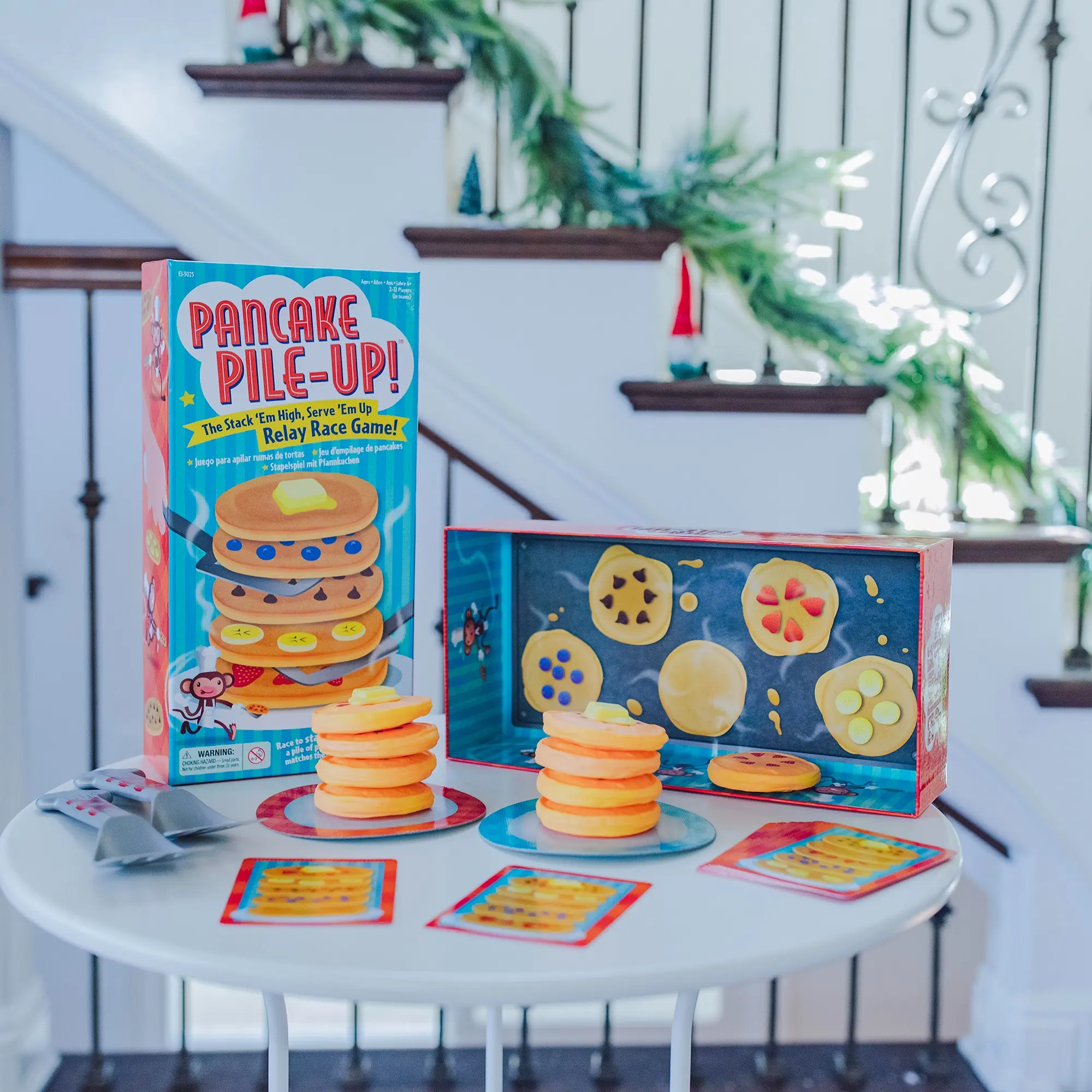 ·HOW TO PLAY: Flip an order card and race to the first pancake shown, use the spatula to place it on your plate, race back, and hand the plate and spatula to the next player, relay-race style. The team that correctly completes the stack shown on the card – with a pat of butter on top – wins the round! Includes 10 pancakes in 5 flavors, 2 pats of butter, 2 plates, 2 spatulas, 10 order cards, and a griddle game board (box bottom) - pieces are also great for pretend play