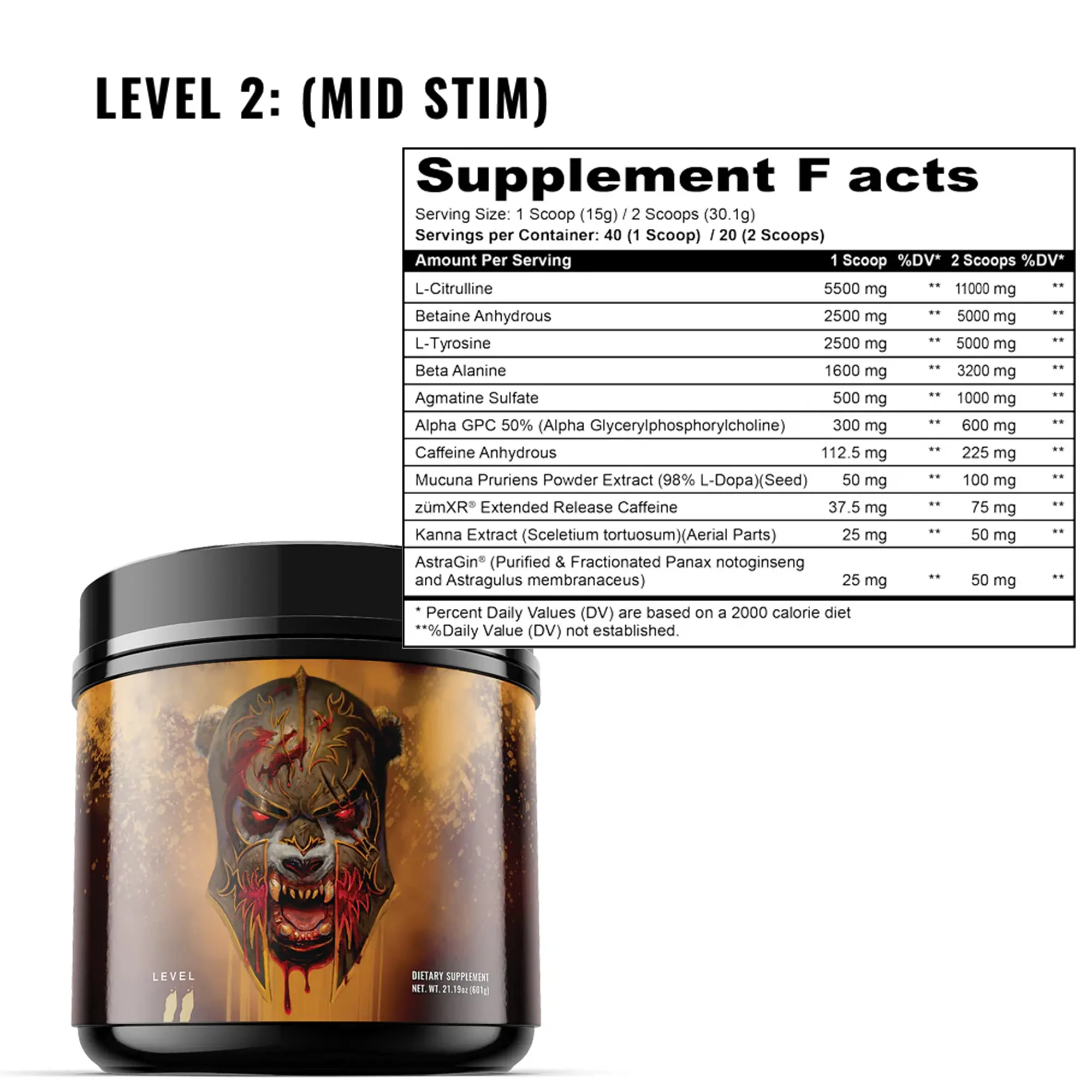 Level 1 (Non-Stim) – Designed for those who want pump, endurance, and focus without stimulants. Ideal for evening workouts or anyone avoiding caffeine.