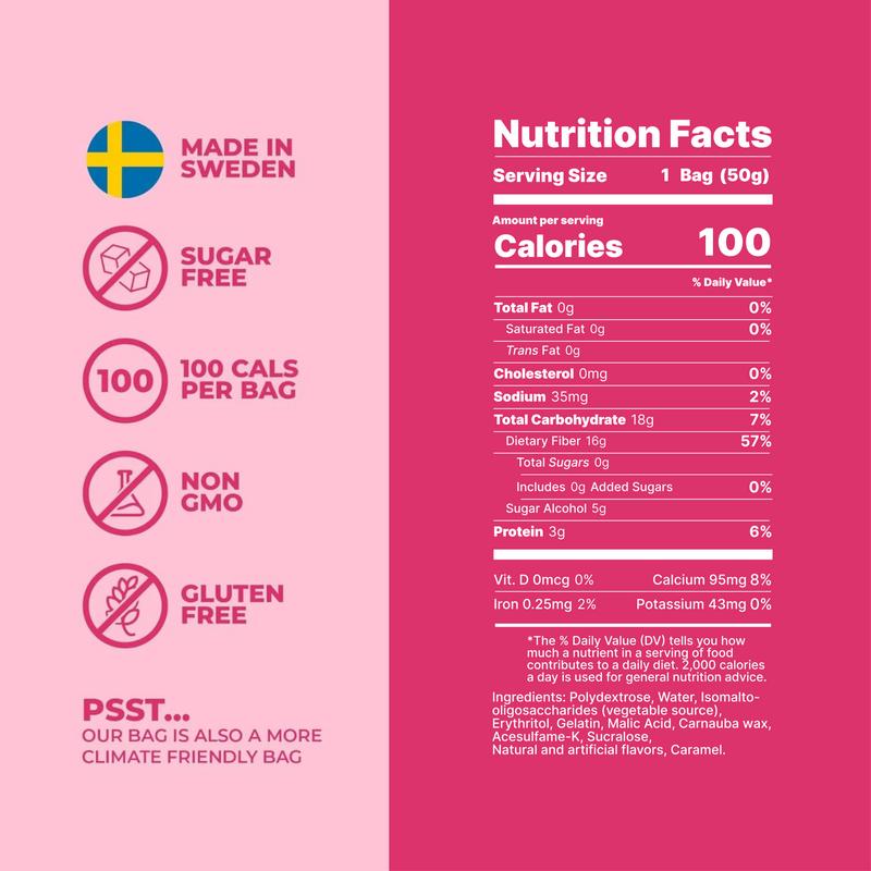 Swedish gummy candy with the taste of original SOUR COLA! The perfect balance of sweet and tangy. One bite, and you’ll be craving more of the fruity flavor! Soft and foamy in the perfectly Swedish way - but no sugar!