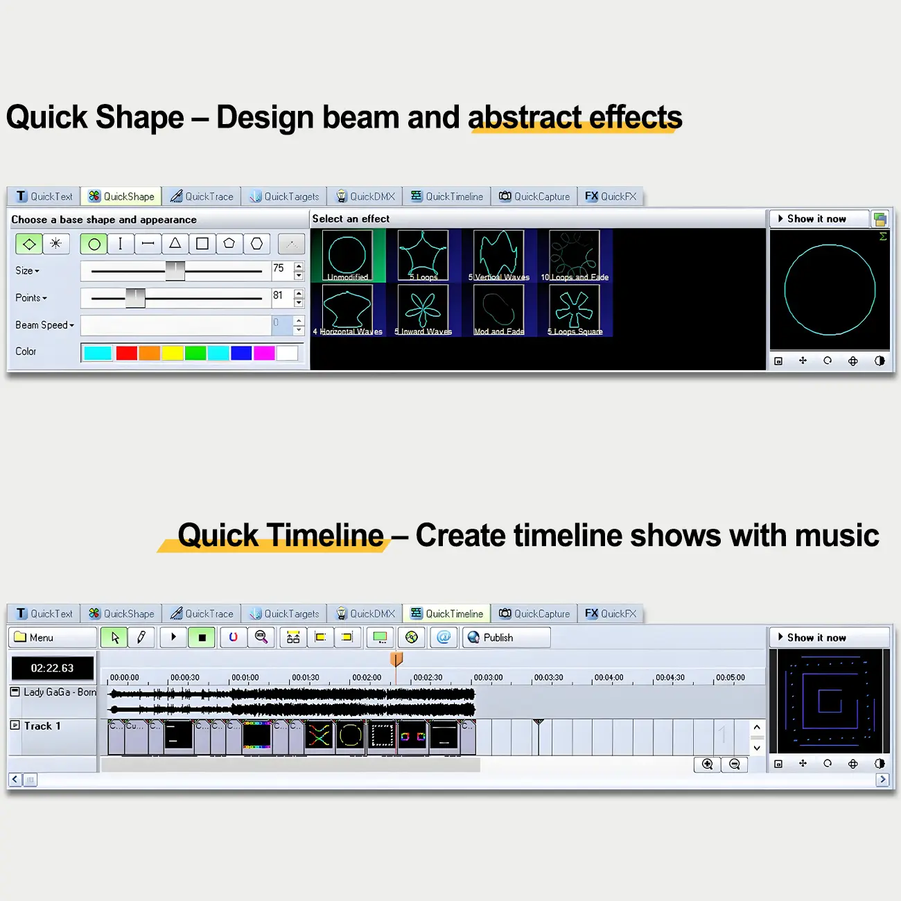 PERFORM LIVE LASER SHOWS and with ease, using QuickShow’s powerful live control engine. Colors, effects, and BPM, as well as size, position, rotation and more, can all be controlled live, in perfect sync with music.