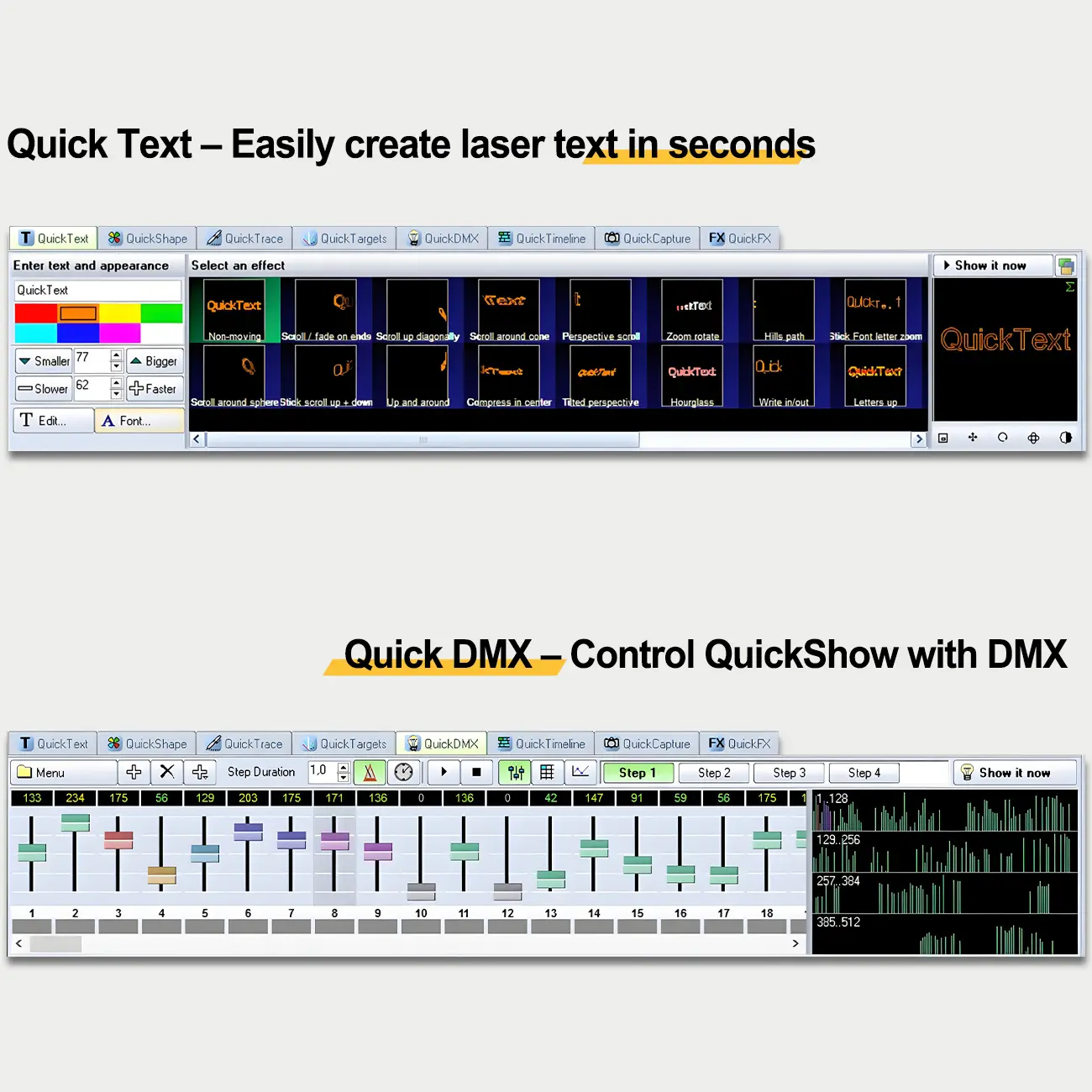 Powerful, Affordable, and Easy to Use… QuickShow is the world’s leading laser show control software and has helped thousands of clients just like you, create stunning laser shows and displays. This FREE program provides all the tools you need to create beautiful laser content in just seconds (laser beams effects, graphics, logos and text). And you don’t have to worry about complex programming, to bring your laser visions to life. No matter if you are new to lasers or a seasoned professional, QuickShow brings your artistic style to life, in beautiful laser light.