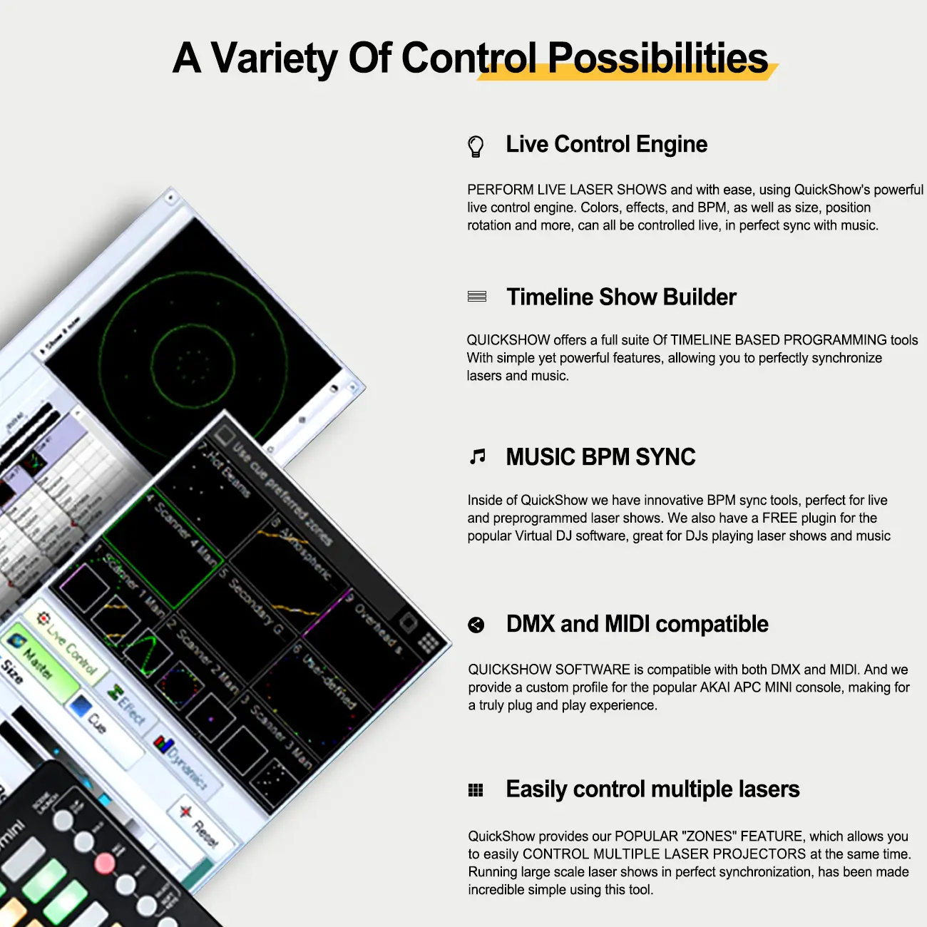 QUICKSHOW SOFTWARE is compatible with both DMX and MIDI. And we provide a custom profile for the popular AKAI APC MINI console, making for a truly plug and play experience.