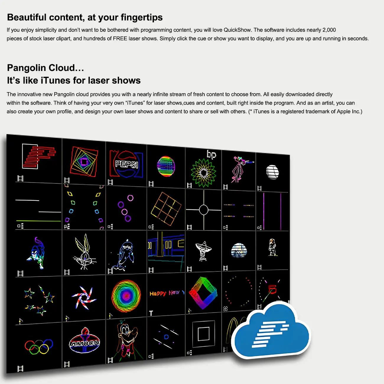 The innovative new Pangolin cloud provides you with a nearly infinite stream of fresh content to choose from. All easily downloaded directly within the software. Think of having your very own “iTunes” for laser shows, cues and content, built right inside the program. And as an artist, you can also create your own profile, and design your own laser shows and content to share or sell with others. (* iTunes is a registered trademark of Apple Inc.)