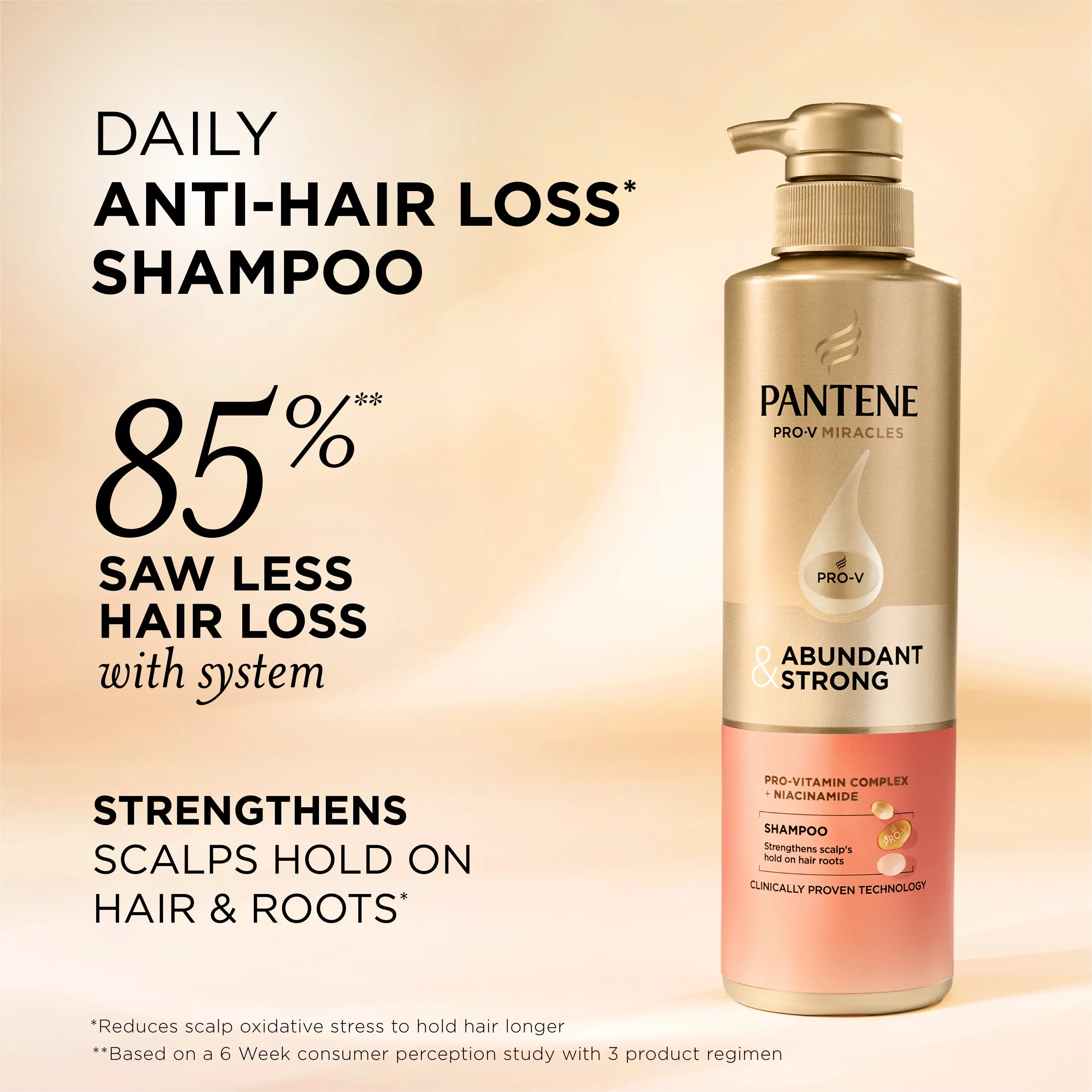 Hair loss isn’t always about regrowth — sometimes it’s about helping your hair stay where it belongs. Pantene Abundant & Strong Daily Anti-Hair Loss* Shampoo is designed to strengthen your scalp’s hold on existing hair.