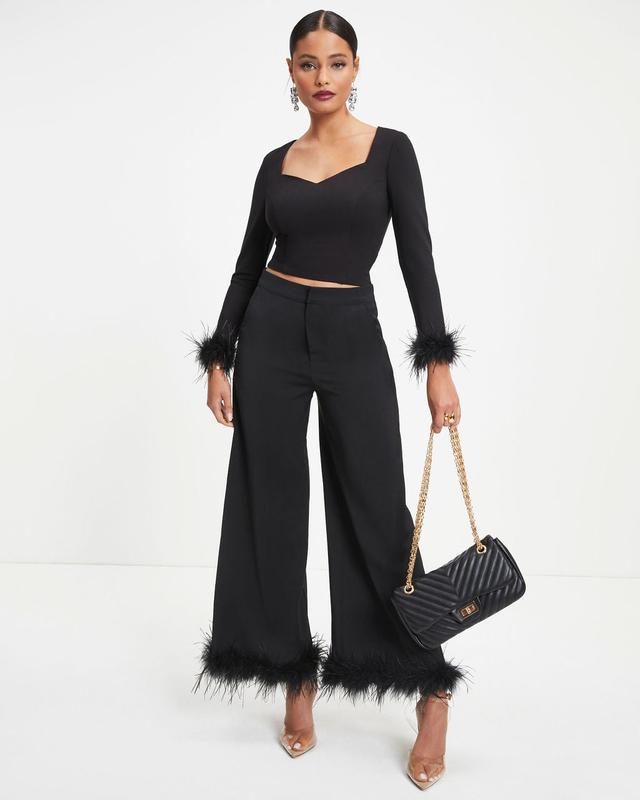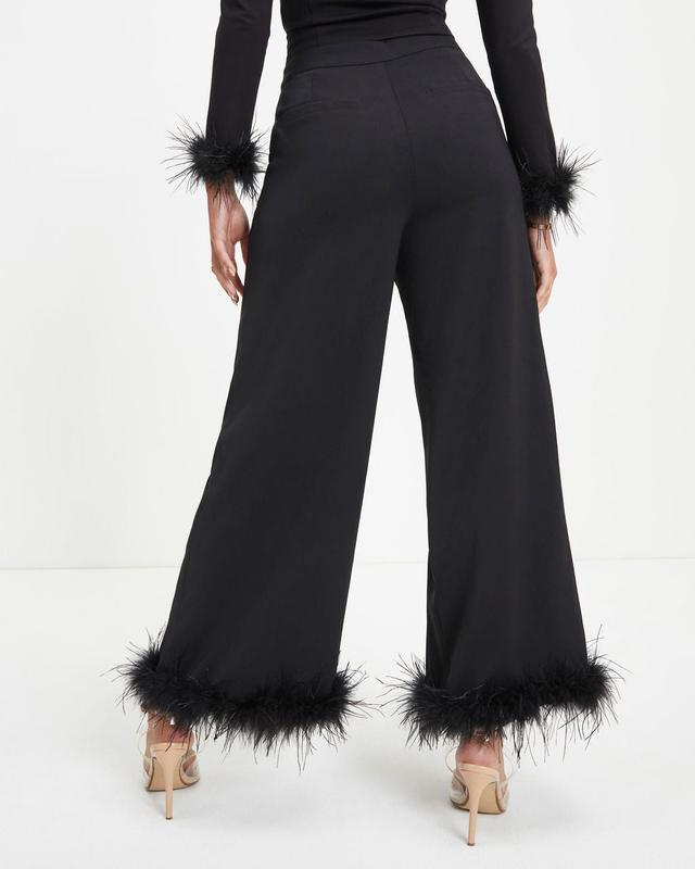 Festive meets femme in the New Lover Feather Trim Pocketed Pants in black that feature a feather trimmer.