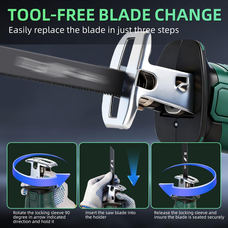 Small reciprocating saw features an auto-locking all-metal collet that allows you to change the blade very easily, safely, and instantly without the need for any other auxiliary tools, allows even beginners to quickly change blades and start working efficiently, saving time and effort