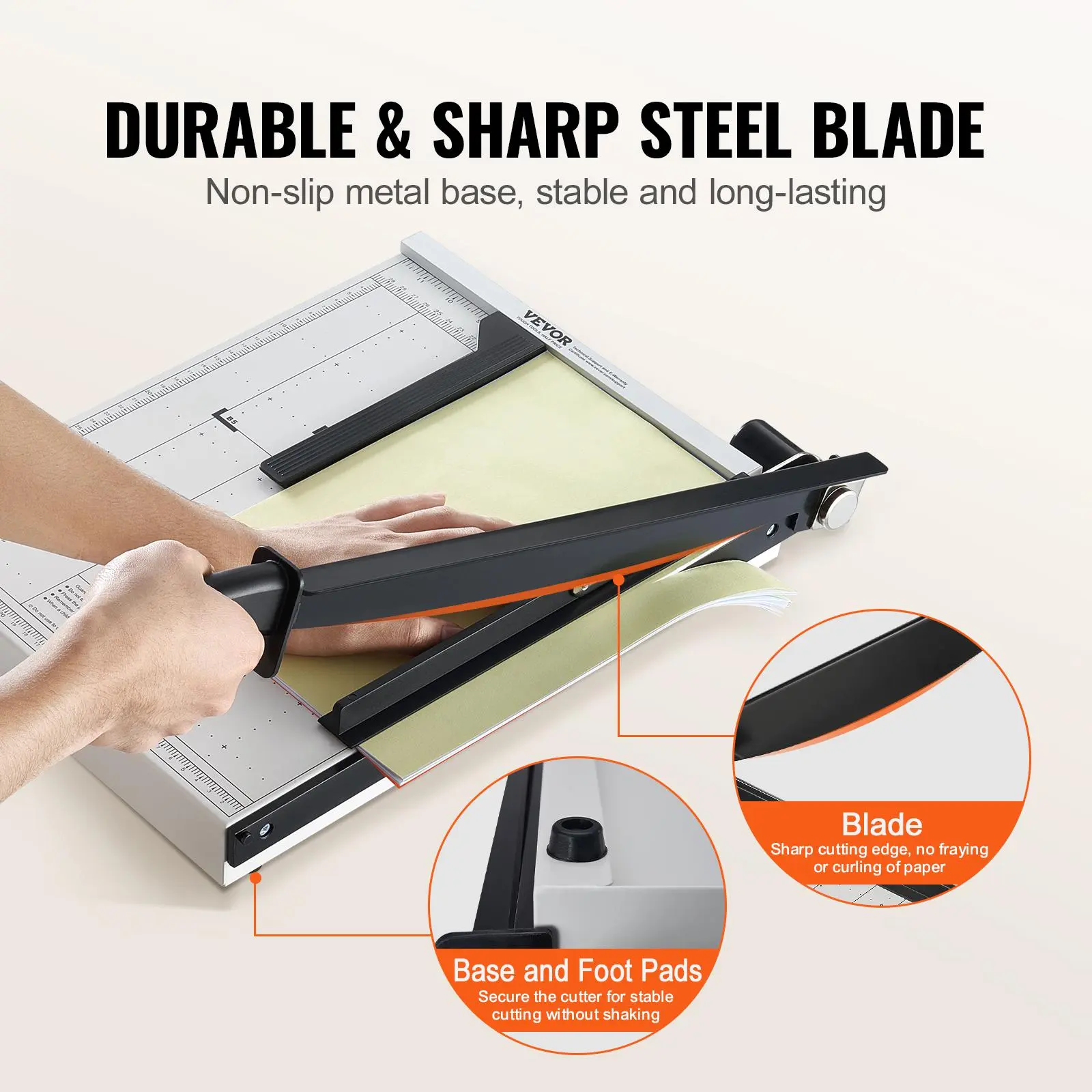 • Built to Last: Crafted from tough steel material, our guillotine paper cutter stays sharp for the long haul. The sturdy metal base provides a stable foundation, and the non-slip foot pads keep it securely in place. It's built for durability and stability.