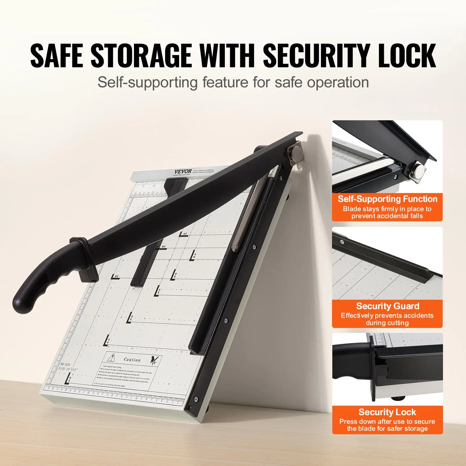 • Security First: Your security matters to us. Our paper cutter guillotine features a self-supporting blade design for secure and stable cutting. Plus, it comes with a guard rail and blade lock for peace of mind during use and storage.