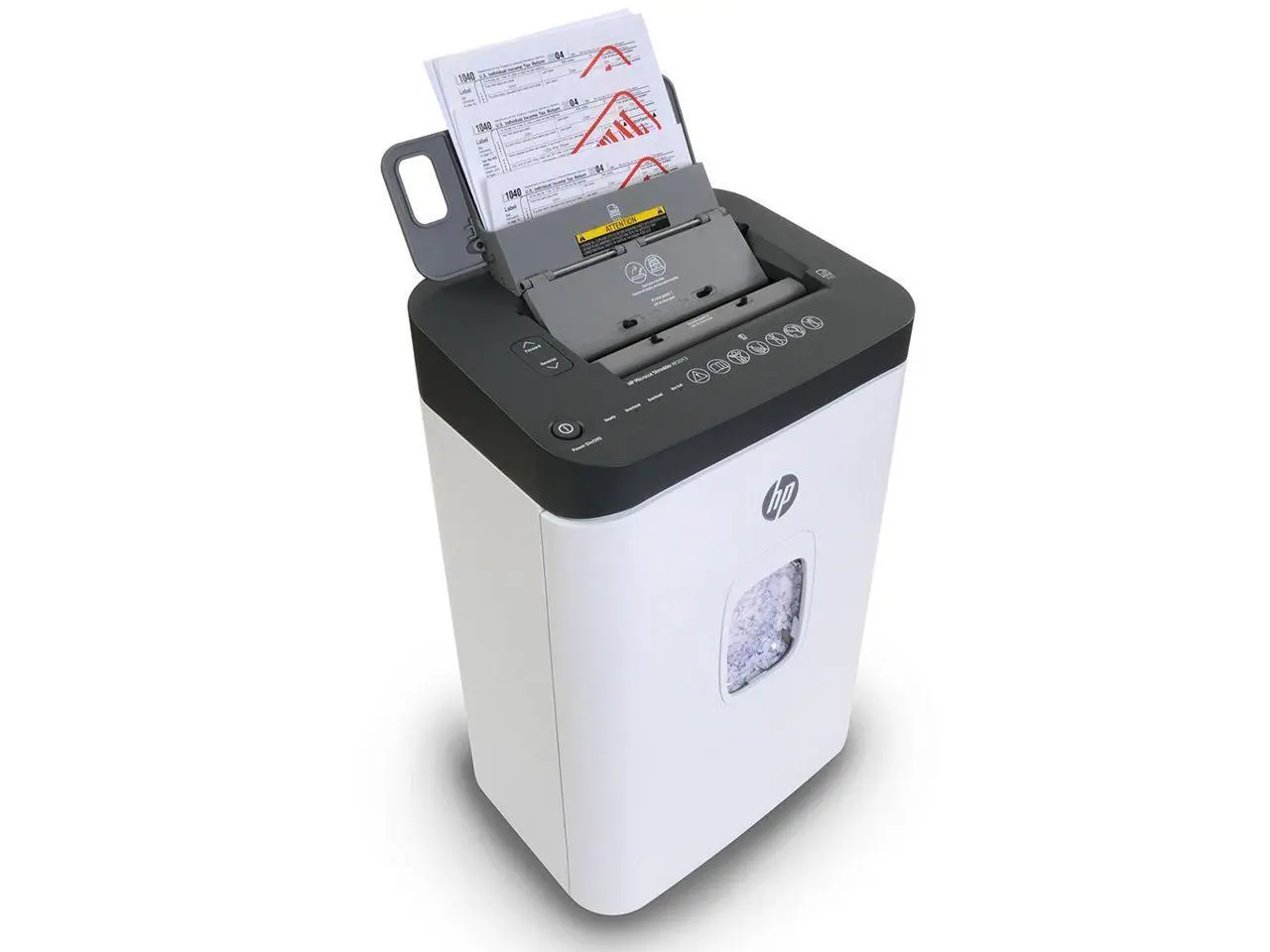 Place a whopping 200 sheets of paper into the auto-feeder and walk away! The Heavy-Duty Hewlett-Packard AF2013 automatic sheet-feeding shredder does the work for you by shredding each page until the auto-feeder is empty. The manual slot accepts up to 13 sheets of bond paper at a pass and expired credit cards as well. It boasts a super-long 60-minute duty cycle for continuous shredding until the job is done. An LED message center displays Ready, Bin-Full, Overheat, and Overload Indicators. The extra-large 7.4-gal. pullout waste bin holds hundreds of shredded pages and casters for easy mobility. The AF2013s microcut technology reduces paper to tiny chips, ensuring destruction of the most sensitive of documents. It comes with a full 1-year warranty.