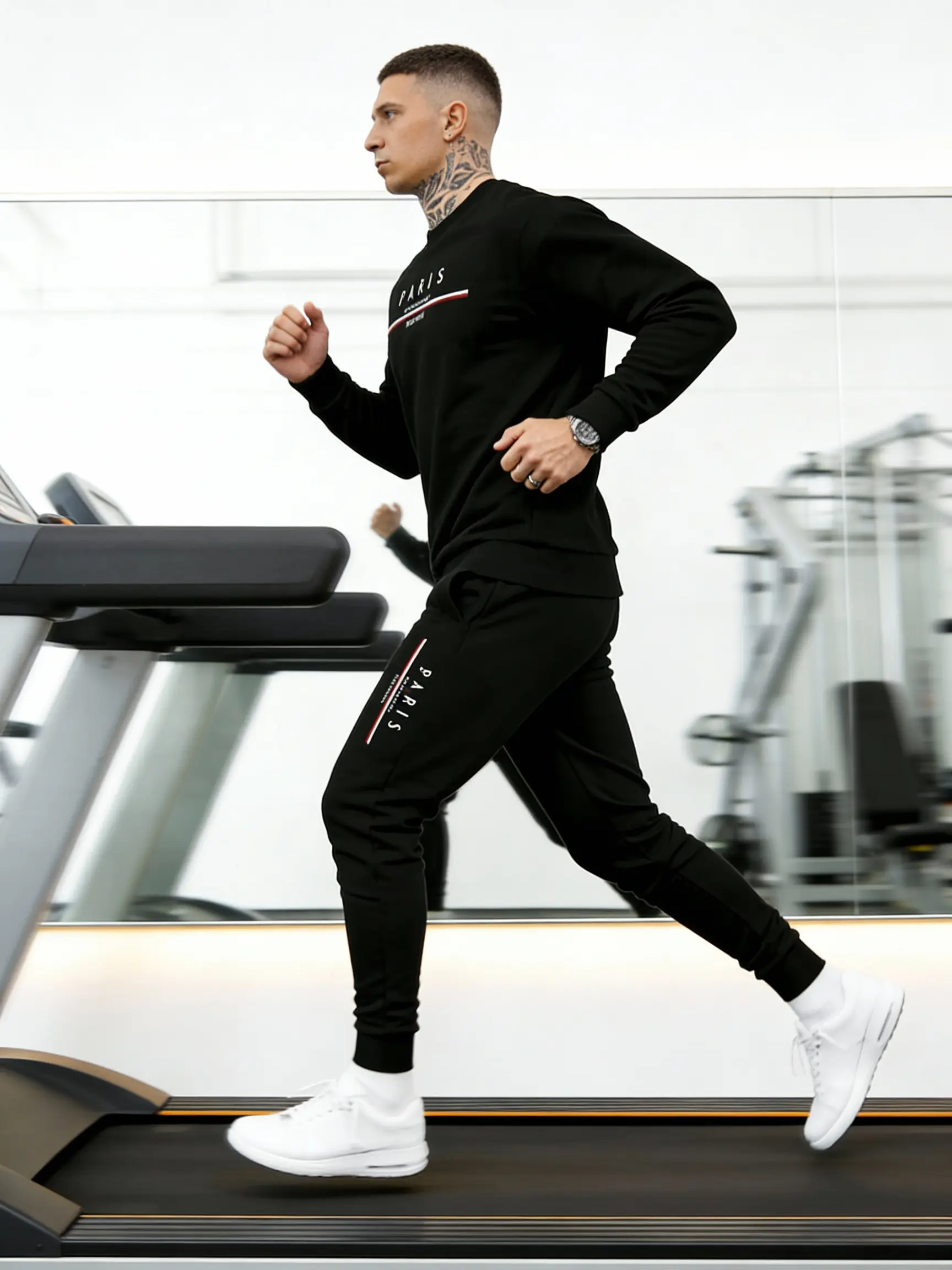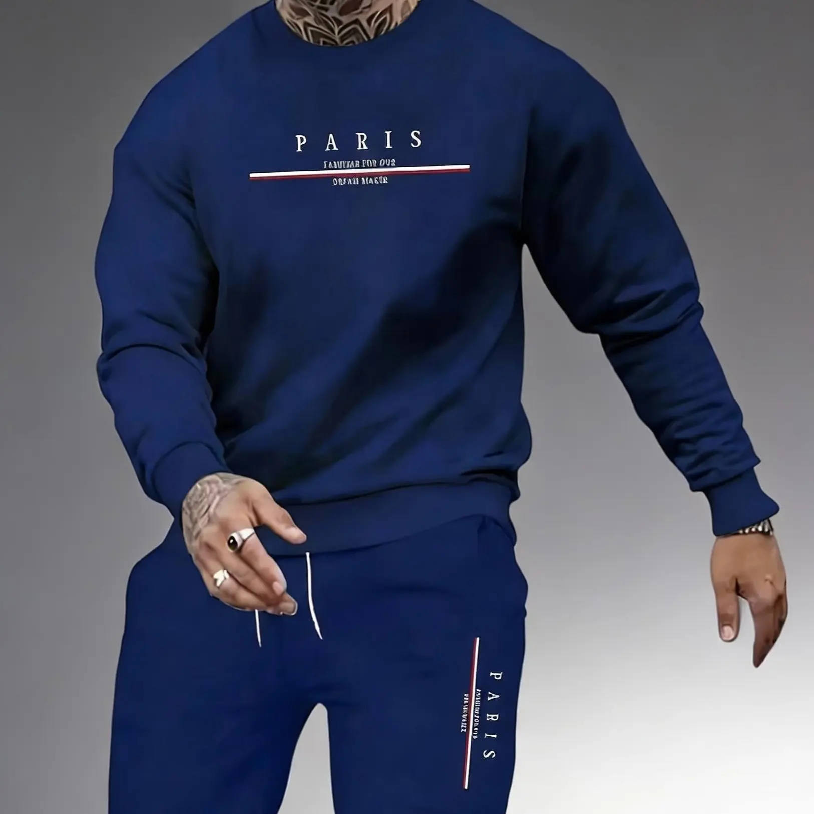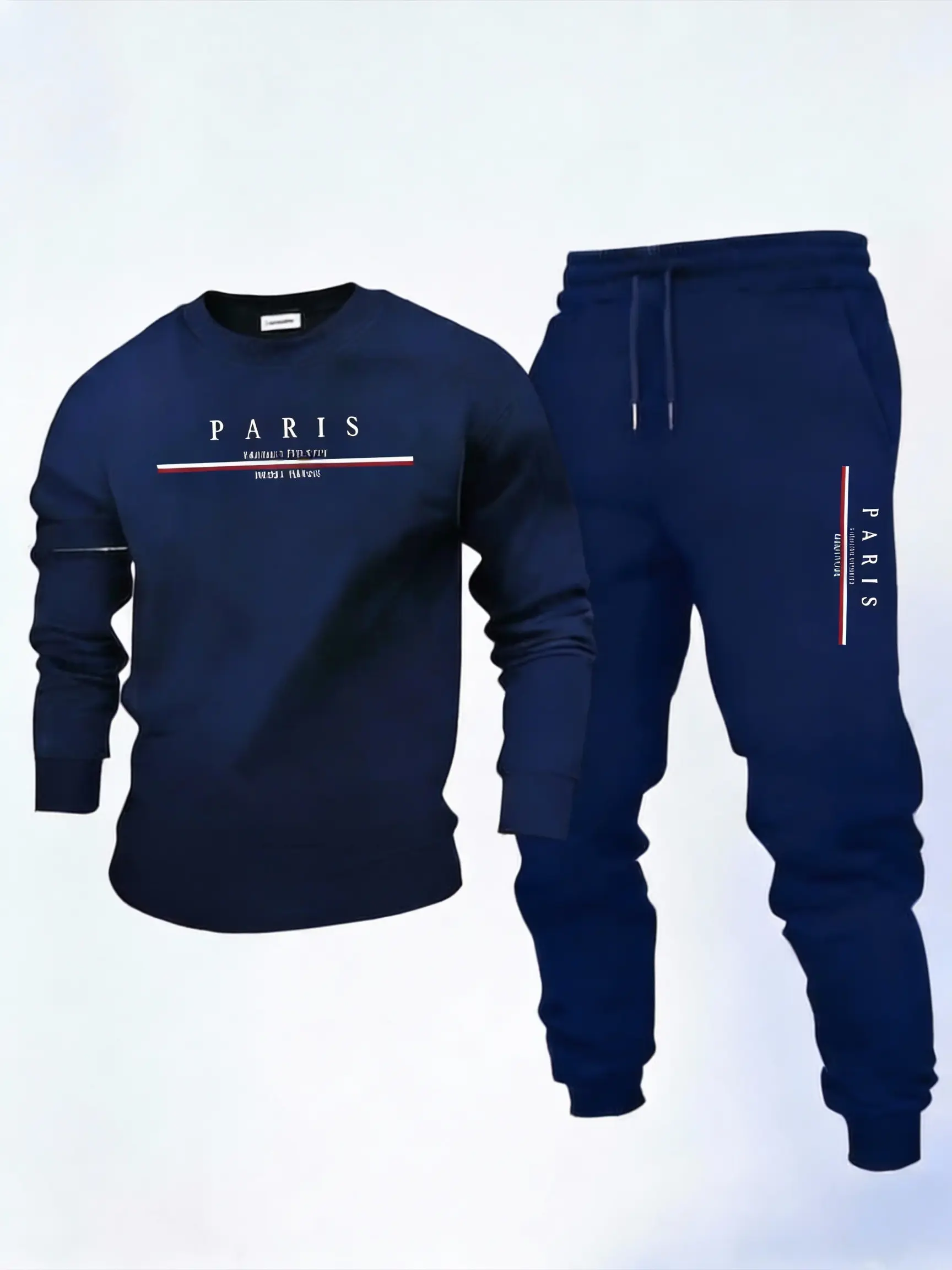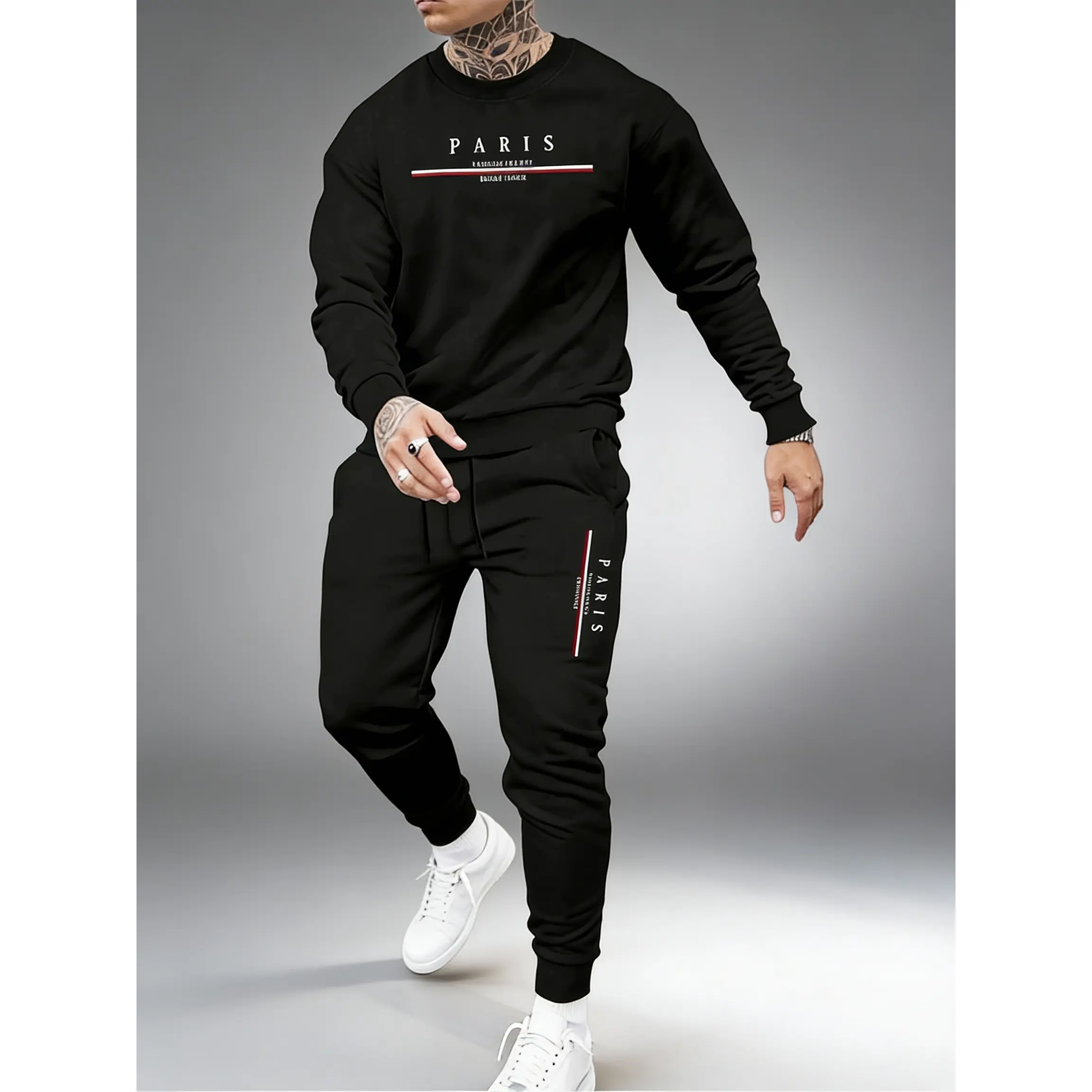 ·The set features a stylish "PARIS" graphic on both the crewneck and joggers, adding a touch of flair. 🏙️