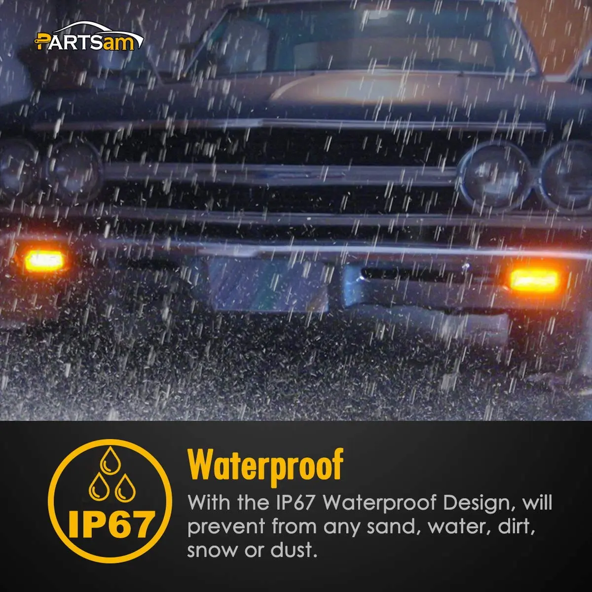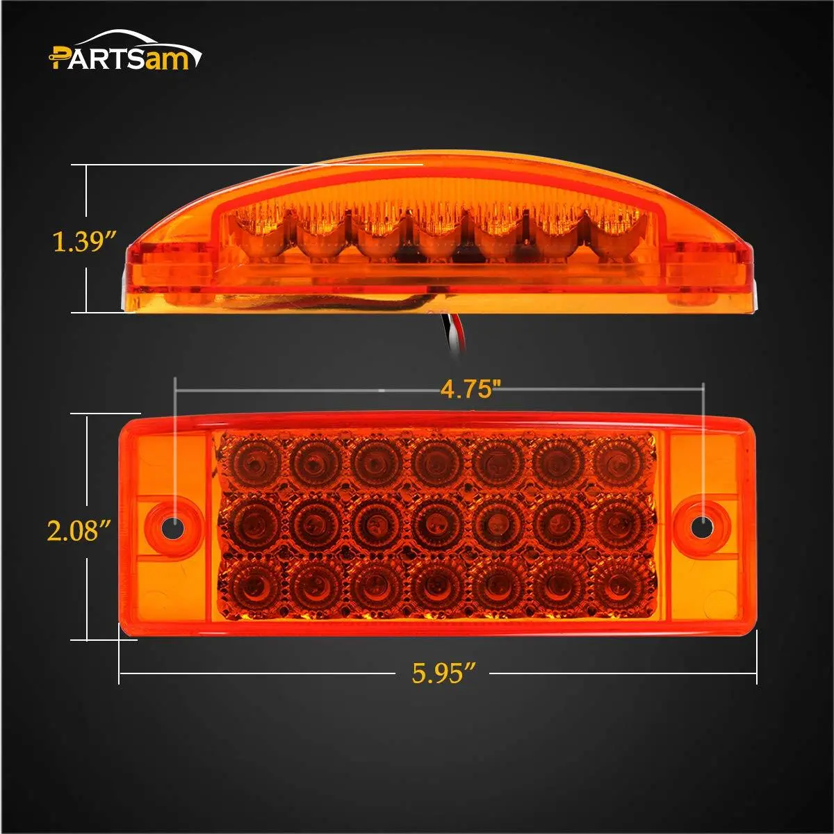 Design: Rectangular 6" x 2" x 1.4" amber LED lights with 21 LED diodes per light