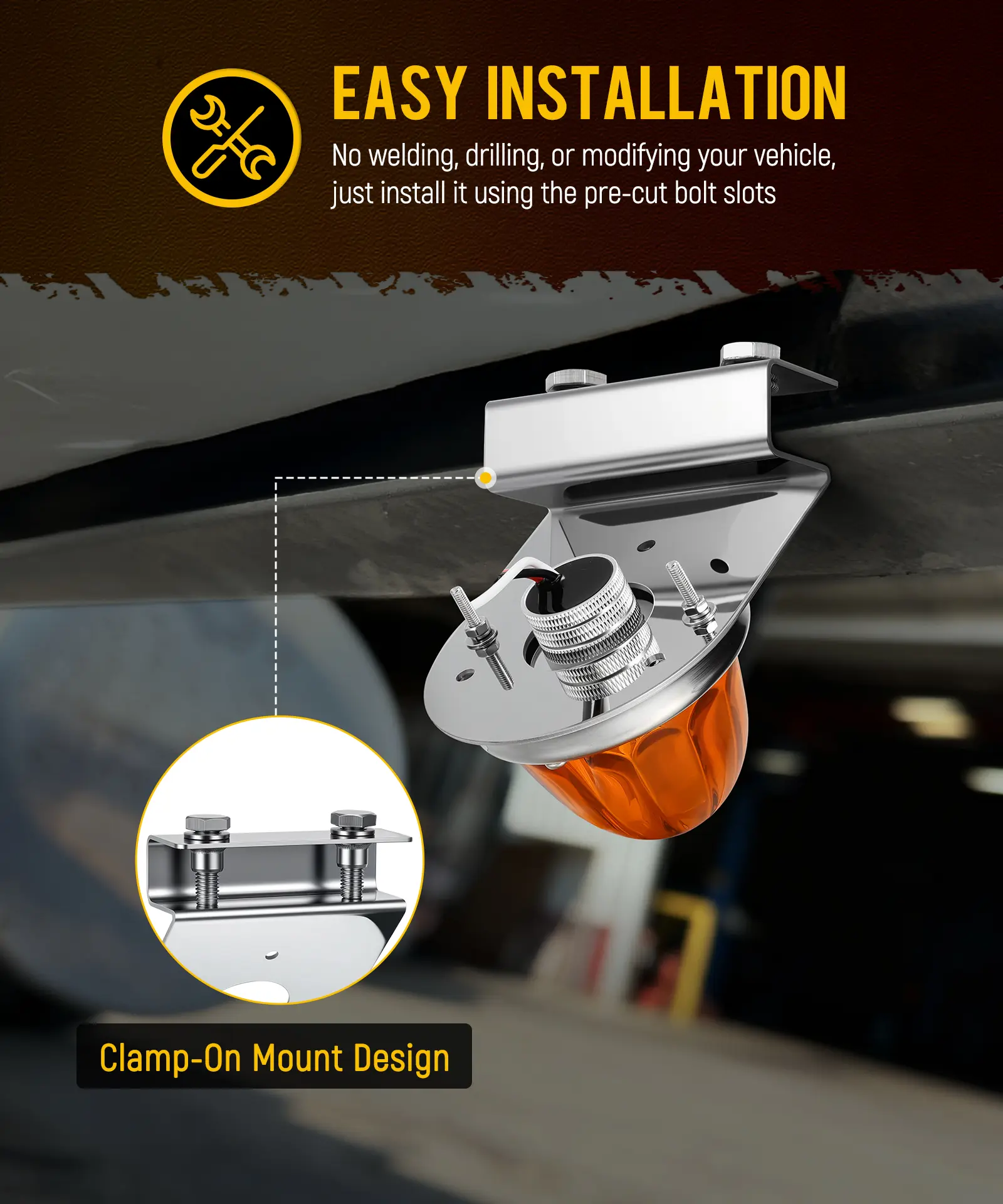 Clamp-On mount design requires no welding, drilling, or vehicle modification. Install using pre-cut bolt slots. Function as marker lights, turn signals, or underglow lights.