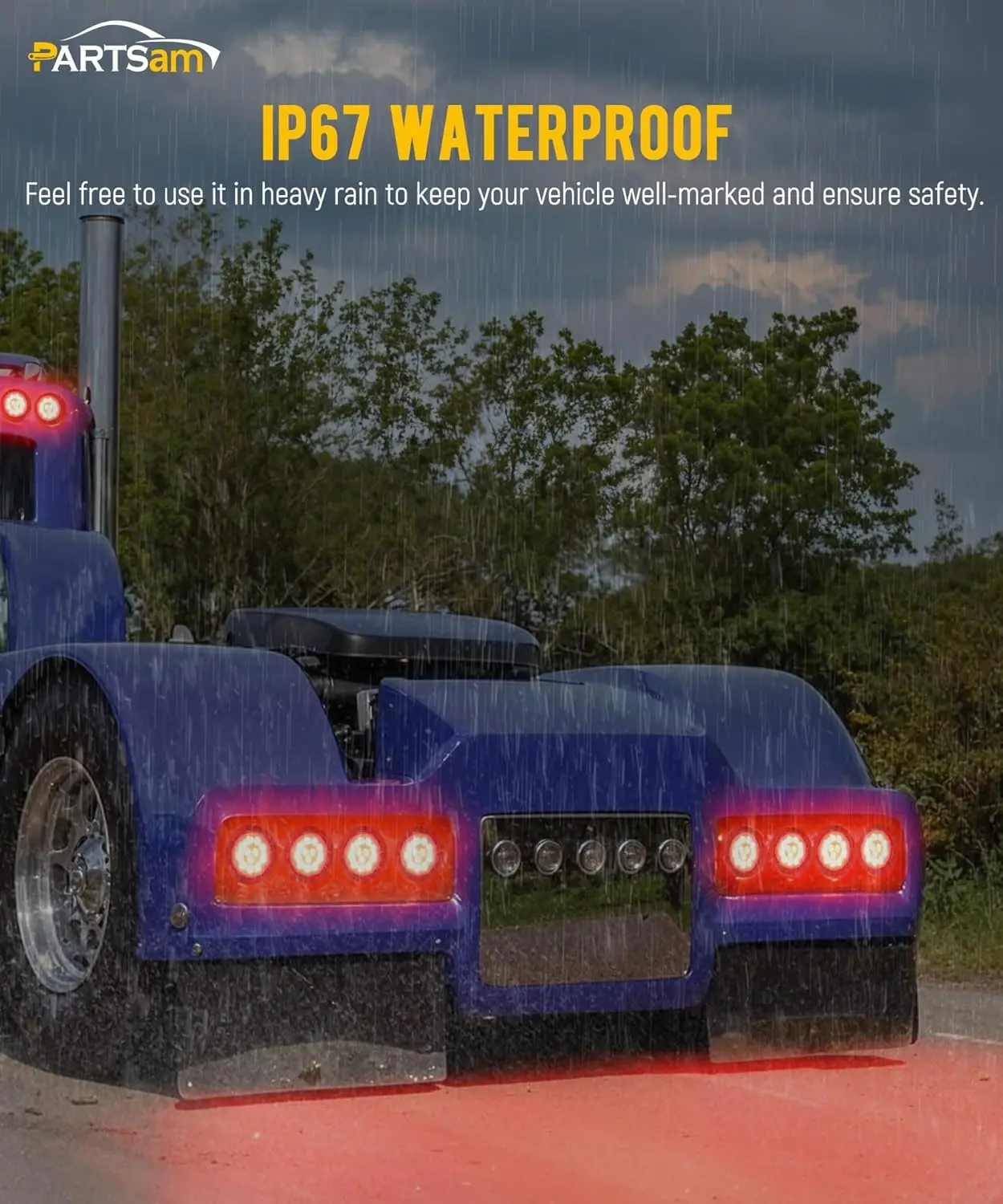Acts as stop, turn, and tail lights. Features 12 bright LEDs, recessed grommet mount, and standard 3-prong plug. Waterproof (IP65) for all-weather durability.