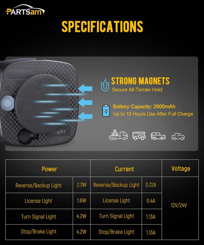 ·【FAST CHARGING】 Equipped with a USB-C charge port, this rechargeable tow lights kit reaches a full charge in 2.5 hours and offers up to 10 hours of continuous operation. Includes a steel anti-loss cable for added peace of mind during travel.