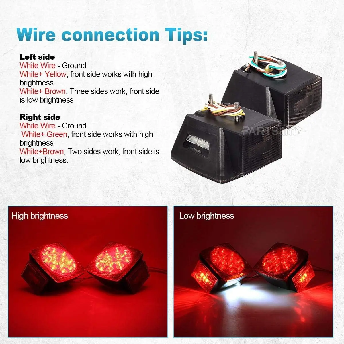 Pre-wired with clear connection tips (white=ground, yellow/green=high brightness, brown=low brightness). Includes gaskets and screws for hassle-free setup.