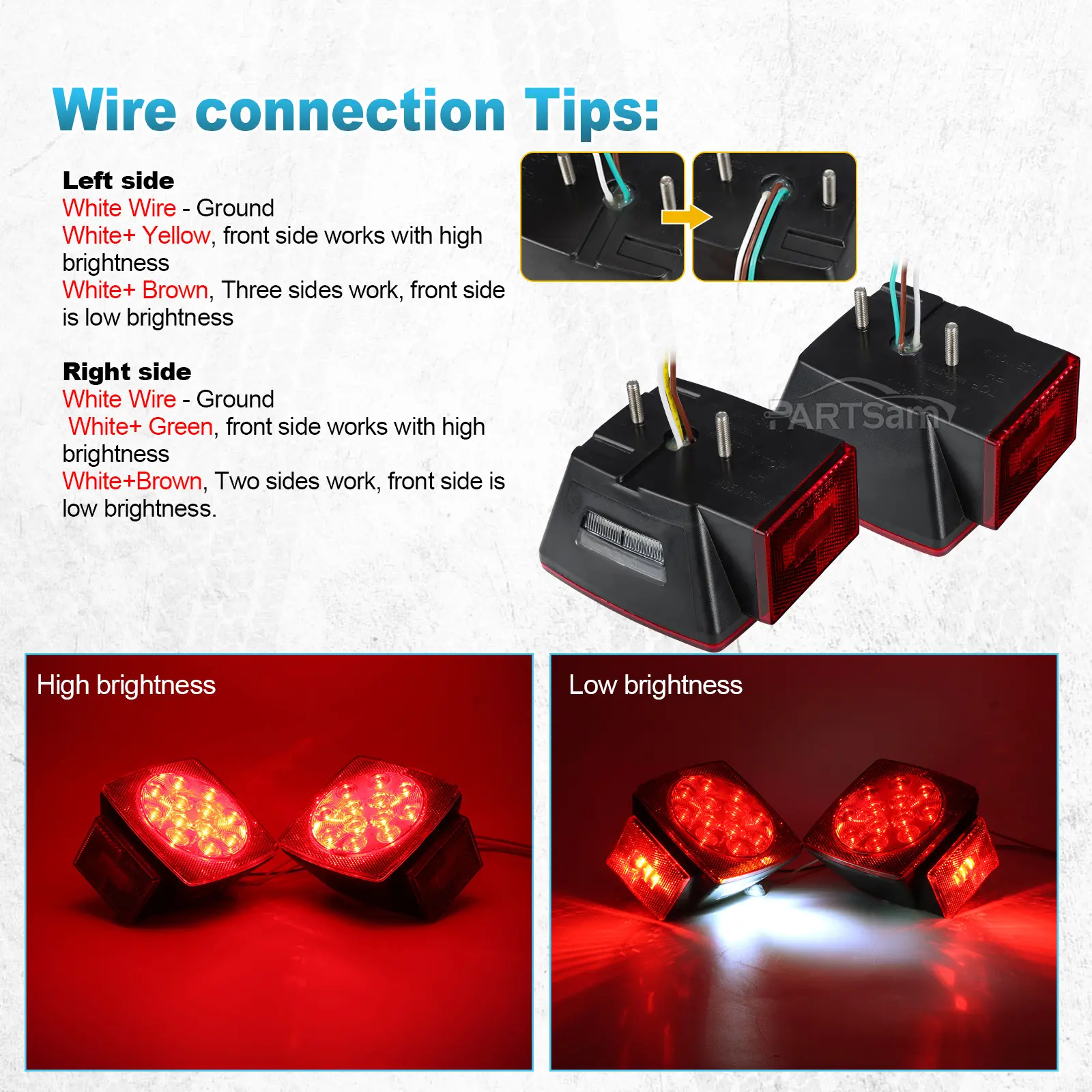 Pre-wired with clear connection tips (white=ground, yellow/green=high brightness, brown=low brightness). Includes gaskets and screws for hassle-free setup.