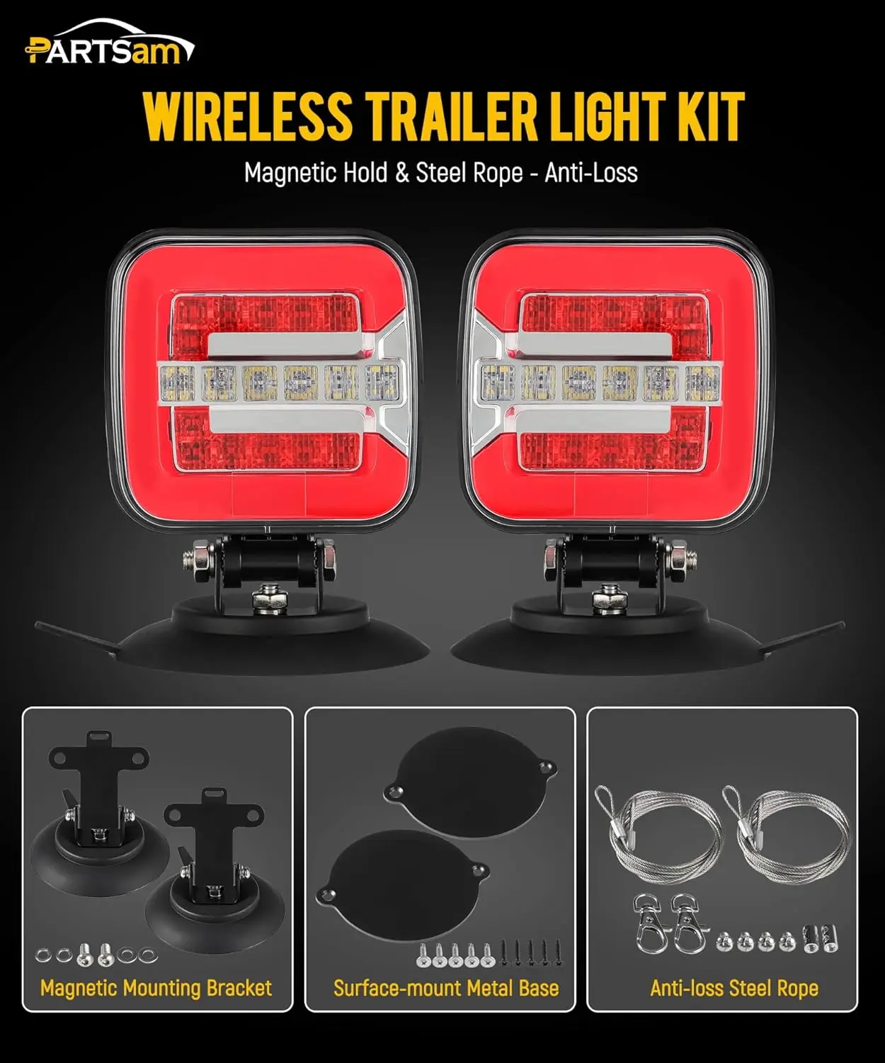 5. Partsam Wireless LED Trailer Light Kit, Square Portable Magnetic Stop Turn Reverse License Towing Tail Lights w/Metal Bracket 7-Pin Plug for Trucks Trailers 12-24V IP67 Waterproof