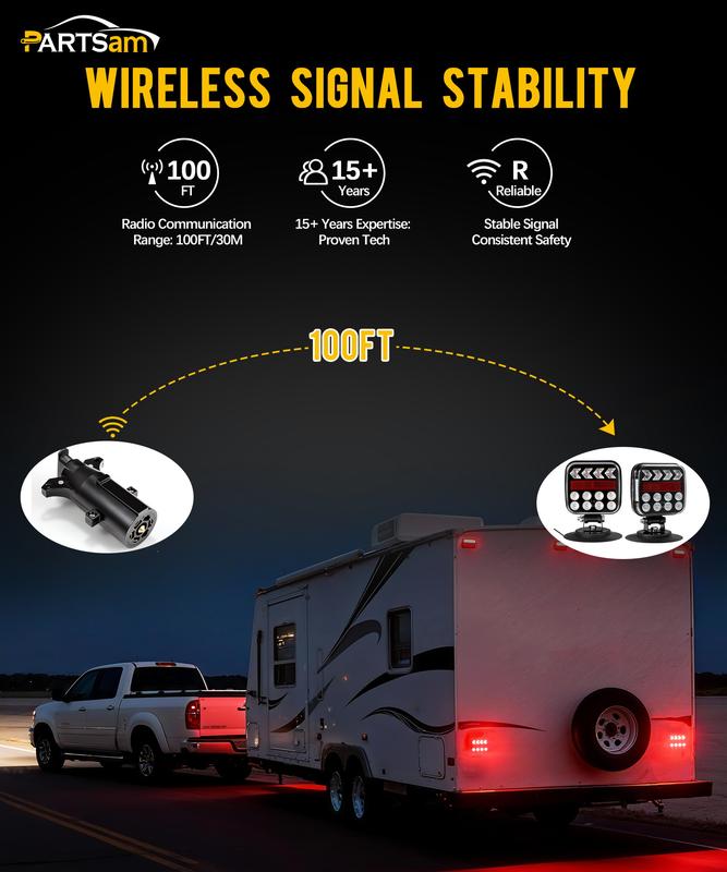 ·【STABLE SIGNALS】This wireless trailer lights kit delivers stable signal transmission up to 100ft, ensuring stable communication and enhanced safety. Perfect for semi trucks, RVs, boat trailers, trucks, and campers.