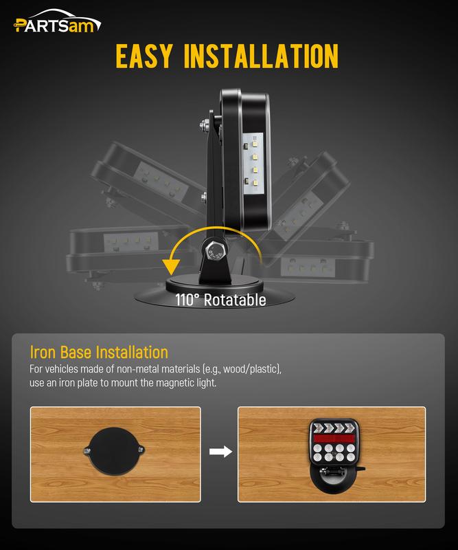 ·【EASY INSTALLATION】Our 110° rotatable wireless trailer light is equipped with magnetic suction cups for secure attachment to metal surfaces, ensuring a firm grip during travel.