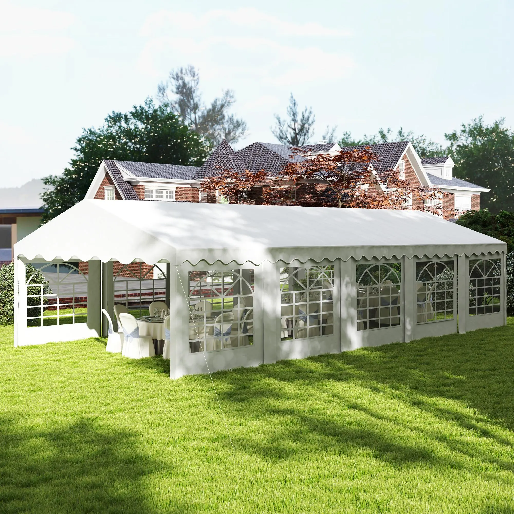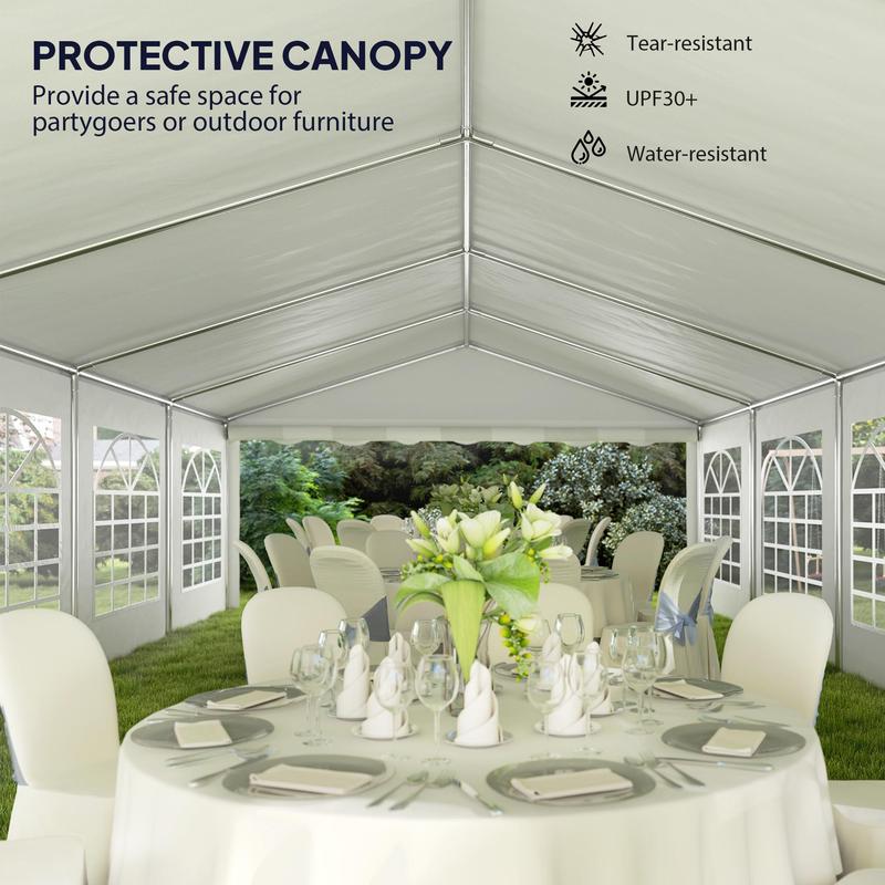 Transform any outdoor space into a majestic setting with the Outsunny outdoor canopy tent with sidewalls. Great for weddings, graduations, or large gatherings, this 16.5' x 33' event tent comfortably hosts 40-50 guests. Revel in a sunlit ambiance through 10 elegant, cathedral-style windows, or open the dual zipper doors to merge with the breeze- all while enjoying UPF30+ protection under a spacious party canopy tent.