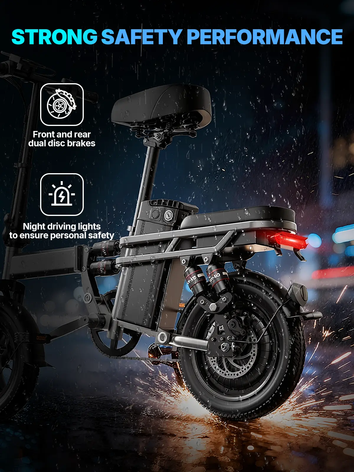 Equipped with a 500W motor, this e-bike provides robust performance. It includes multi-shock absorption technology for a smoother ride. Perfect for commuting, this mini e-bike combines efficiency with style. Its compact size and powerful features make it a practical choice for daily commutes.
