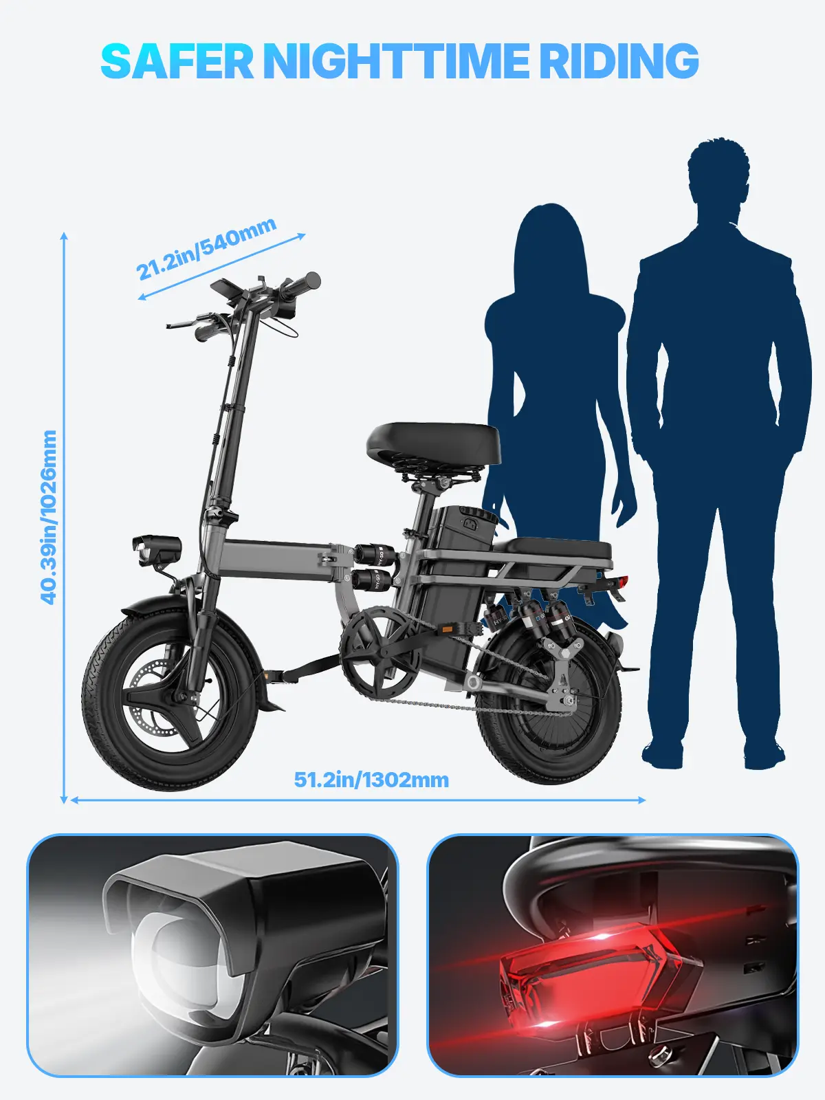 Ideal for adults, this electric bike features a foldable design for easy storage and transport. It comes with a 48V 15Ah removable battery, ensuring ample power for your journey. Choose between 14" or 20" wheels for a comfortable ride. This bike reaches speeds up to 20MPH and can travel up to 30 miles on a single charge.