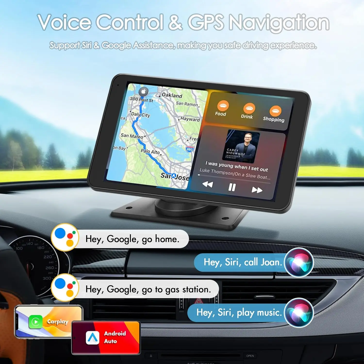 ·【Upgrade Wireless Carplay Screen & Android Auto】Portable carplay screen for car supports Wireless Carplay & Android Auto. You can access your phone's music, map navigation, messages, hands-free phone calls etc. when it simply connects to your smartphone via Bluetooth and WiFi or USB. It also supports voice control via Siri or Google assistant, just speaking commands through Wireless Car Play Touch Screen, providing you with a safer and more convenient driving experience