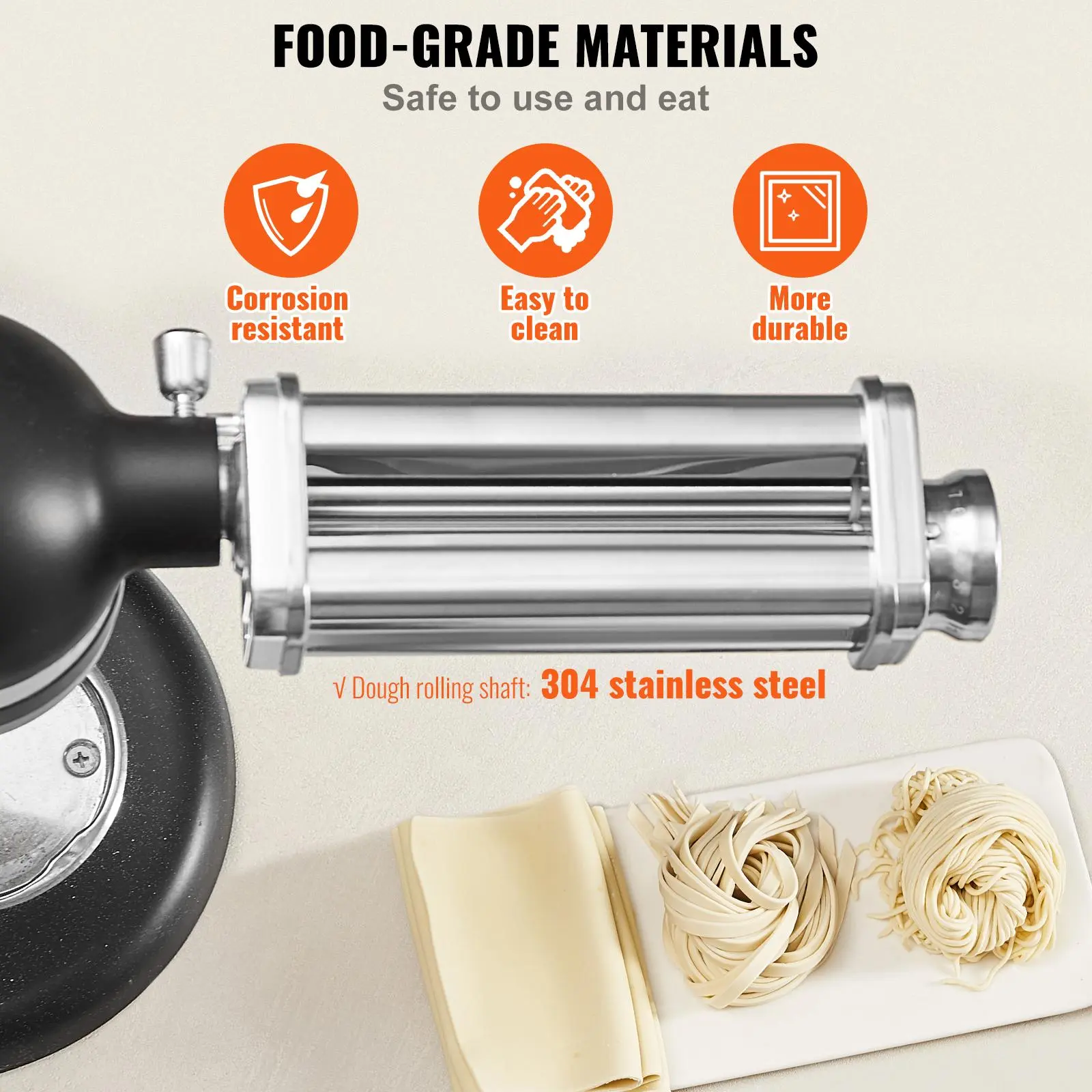 • Food-grade Materials: Entirely made of food-safe materials, ensuring peace of mind when making and eating pasta. The dough rolling shaft is made of 304 stainless steel, which is stable, wear-resistant, corrosion-resistant, and long-lasting without rusting or deforming.